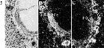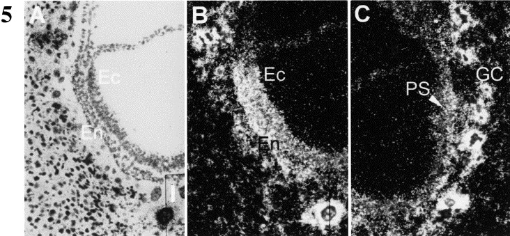 Fig. 5. Localization of mouse fiz mRNA in 7.5 dpc embryos. (A) Bright field illumination showing a sagittal section of the anterior region of a 7.5 dpc mouse embryo in the maternal decidua hybridized with 35S-labelled mfiz antisense RNA probe. (B) Dark field image of (A). (C) Dark field image of primitive streak area of the embryo. Abbreviations: Ec, ectoderm; En, endoderm; GC, giant cell; PS, primitive streak. Bar represents 40 μm.