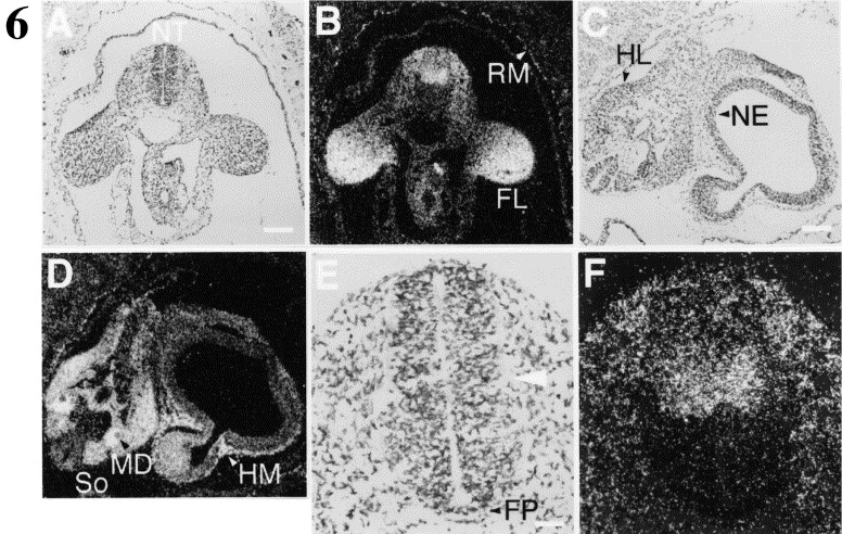 Fig. 6. Localization of mouse fiz mRNA in 9.5 dpc embryos. (A) Bright field illumination of a frontal section through the rostral region of a 9.5 dpc mouse embryo hybridized with 35S-labelled mfiz antisense RNA probe. (B) Dark field image of (A). (C) Bright field illumination of a frontal section showing both the caudal and the head region of the embryo. (D) Dark field image of (C). (E) Enlargement of the neural tube area in (A). Highest expression of mfiz mRNA is marked by a white arrowhead. (F) Dark field image of (E). Abbreviations: FL, forelimb bud; FP, floor plate; HL, hindlimb bud; HM, head mesenchyme; MD, mesonephric duct; NE, neuroepithelium; NT, neural tube; RM, Reichert's membrane; So, somite. Bars represent 160 μm in (A–D) and 40 μm in (E,F).