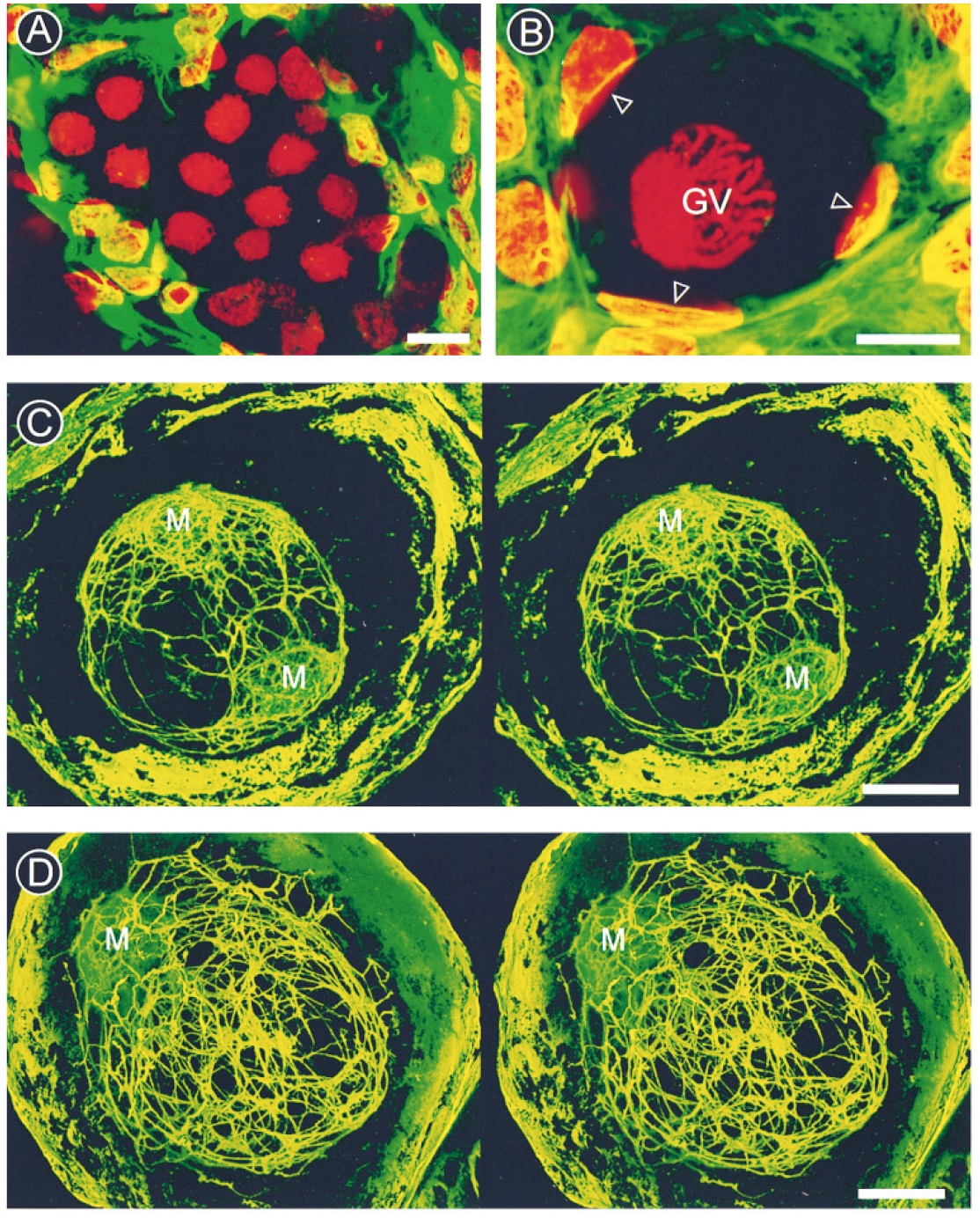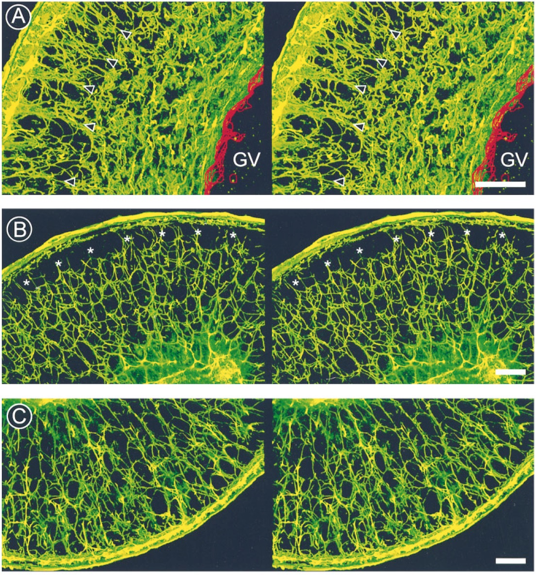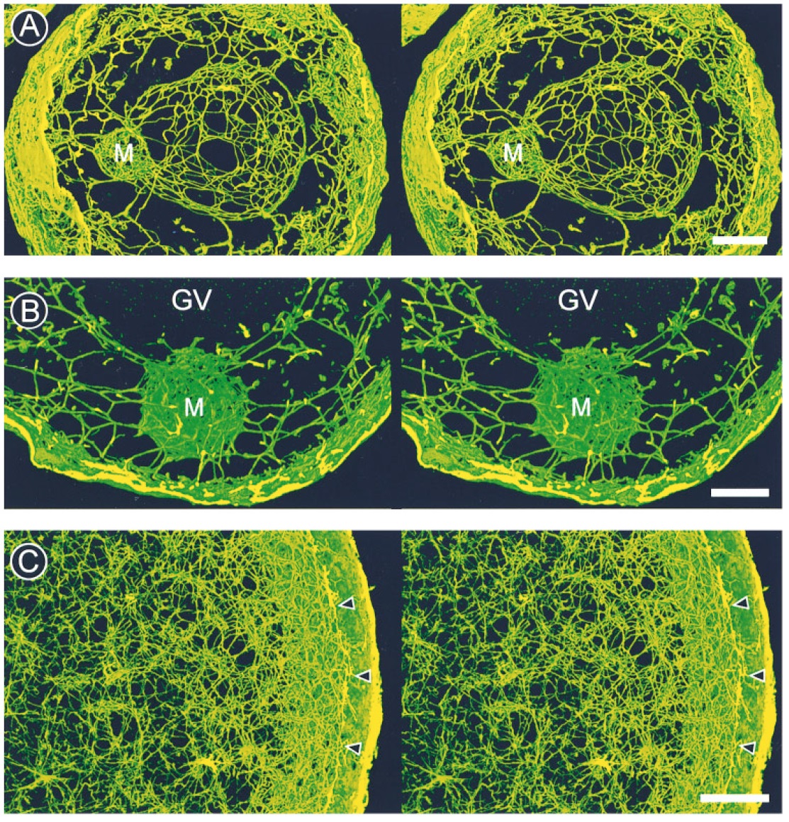 network surrounding the GV (outlined in red). Reconstructed from 20 optical sections. (B,C) Stereo views (both reconstructed from 15