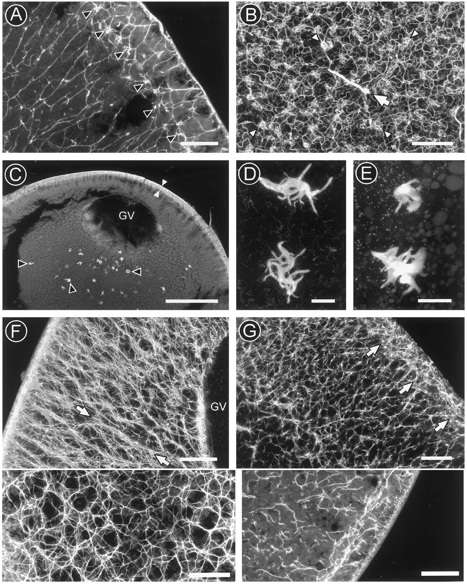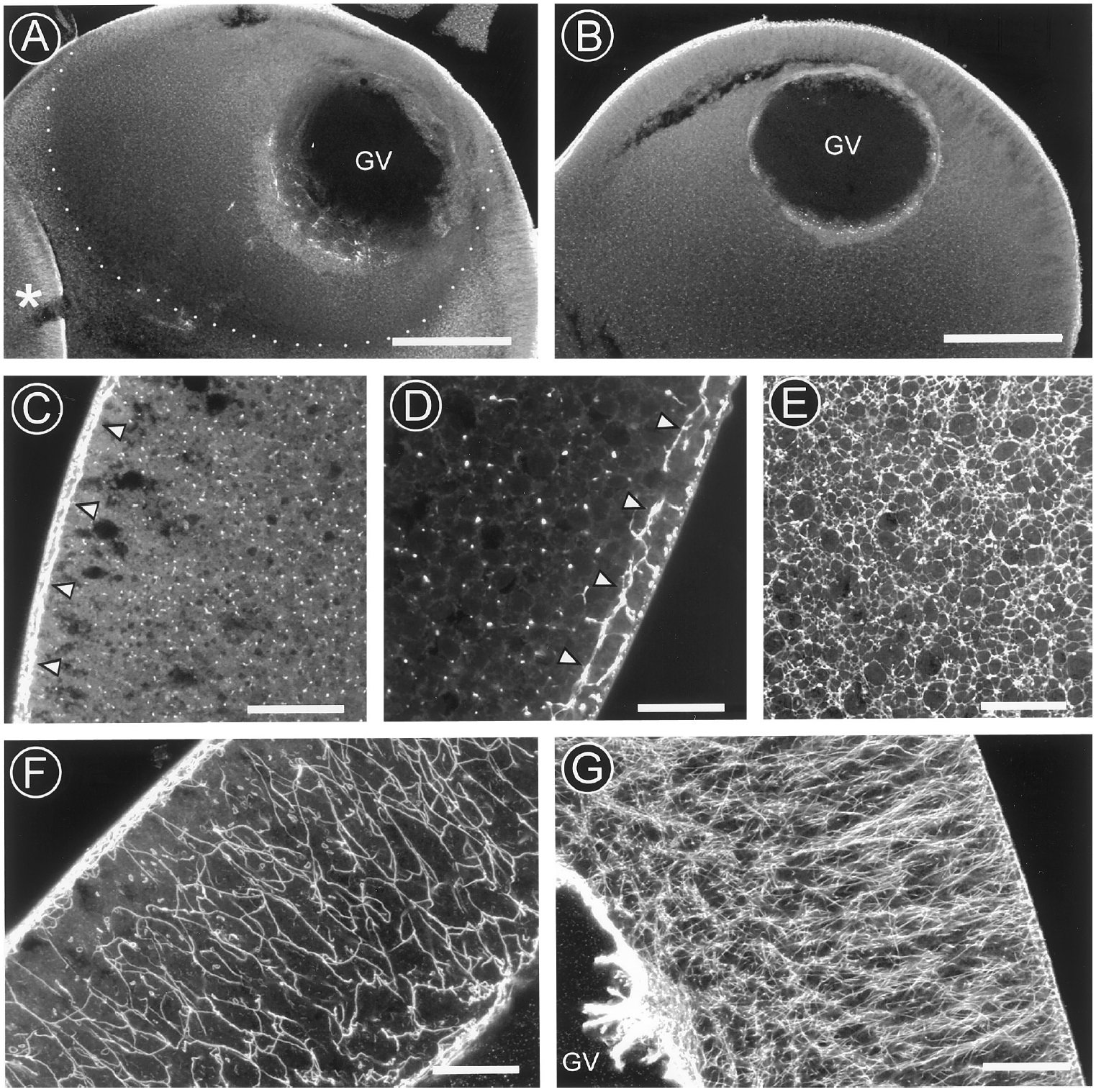 characteristic radial bundles of MTs in the animal hemisphere. Scale bars are 250 mm in A and B, 50 mm in C, and 25 mm in D–G.