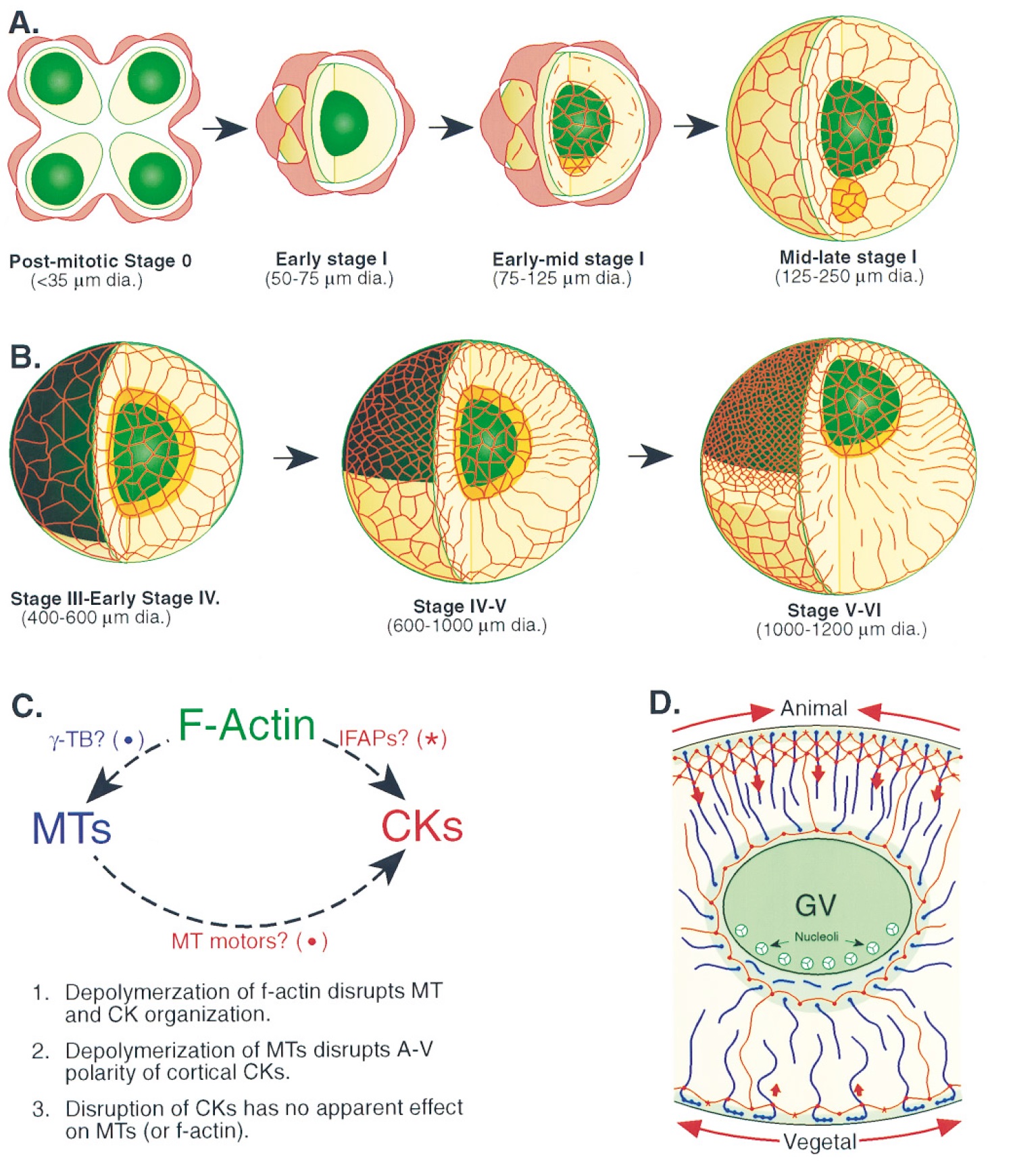 adopt the organization characteristic of stage VI. Summarized from Franz et al. (1983); Godsave et al. (1984), Klymkowsky et al. (1987); Torpey et al. (1992), Ryabova et al. (1993), and this report. (C) Organization and polarization of the CK filament cytoskeleton in stage VI