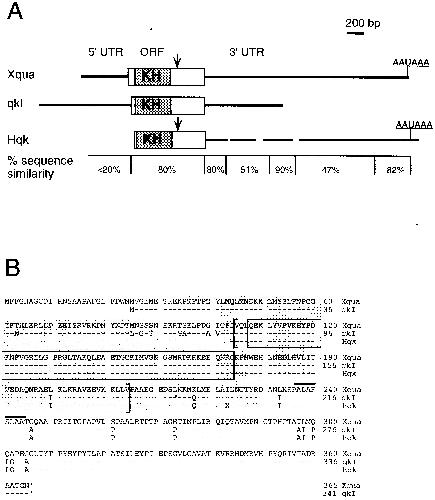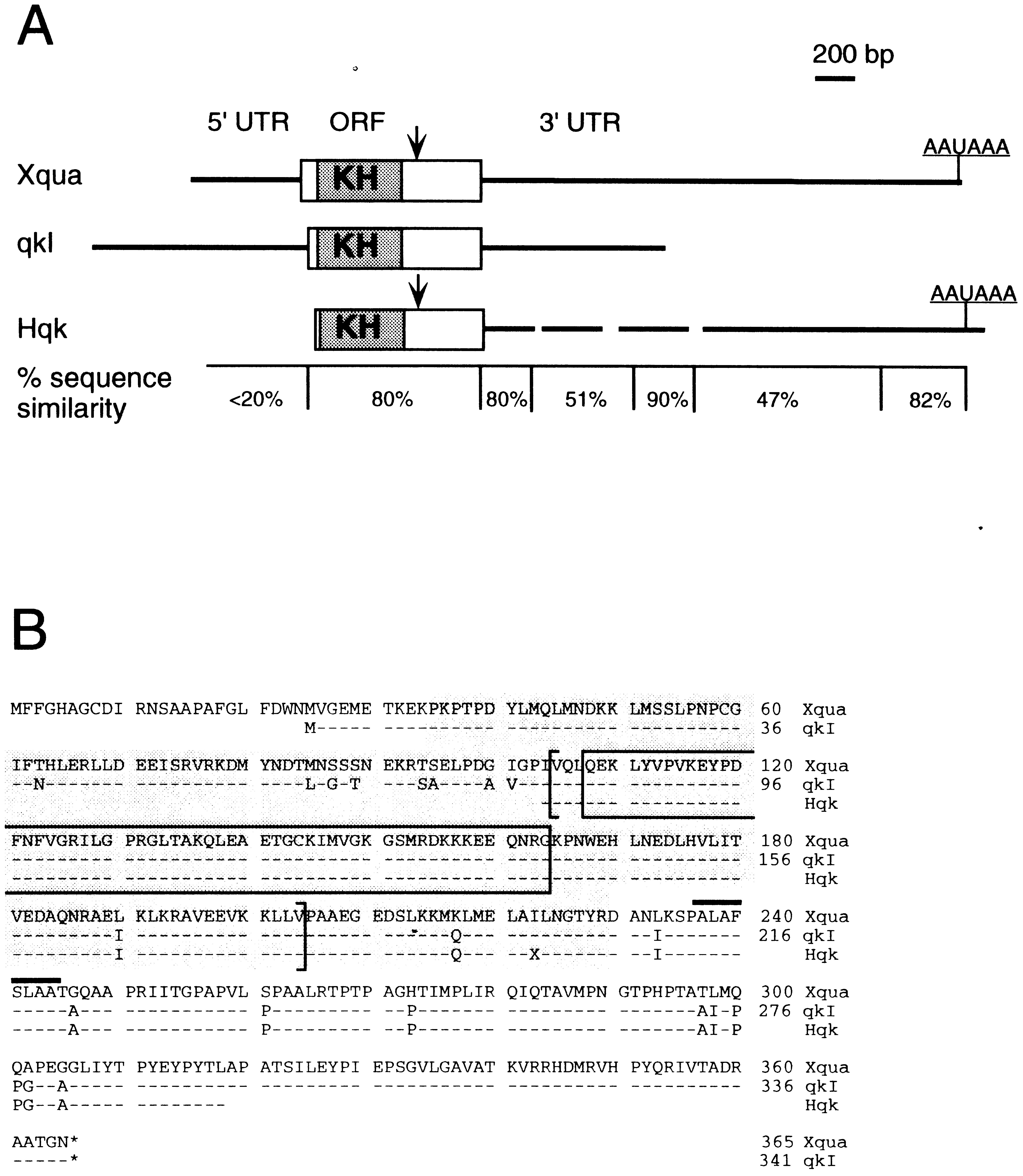 Comparison of the Xenopus and mammalian quaking sequences. (A) Comparison of Xenopus, mouse and human 5 kb qk cDNA sequences, showing percentage nt identity for different regions. (B) Alignment of Xenopus, mouse and human quaking aa sequences. Identical residues are indicated by a dash (–) and the stop codon by an asterisk (*). The standard KH domain is boxed and the extended KH domain is included in parentheses. The region of similarity found in the GSG/STAR subfamily is highlighted in gray. The sequences that can be alternatively spliced in Xenopus and human are indicated by a bold overline. The human ORF was compiled from overlapping ESTs and spans a region equivalent to pXqua aa 103–318. (C) Alignment of the three blocks of the 3′ UTR sequence that are highly conserved between Xenopus, mouse and human. The Xenopus sequence is presented above with identical nt indicated by a dash (–), spaces in the sequence represent deletions or insertions and unknown sequence is indicated by (?). The accession numbers for human EST entries containing qk sequences are: T78719, R21227, R1228, R63053, R62996, R12087, R36880, R12116, R36870, R25054, R45393, R51027, H05147, H16837, Z28670, Z24967, T34625, R57586, R57984, R58351, Z33552, H47907, T82267, T83554, H41198, H41197, H41765, H41764, H49924, H50457, H47907, H47906, H66634, H87919, R51134, H05190, D59576, D62391. Sequences were multiply aligned using CLUSTAL V ( Higgins et al., 1992) and Assembly-Lign (IBI Inc).