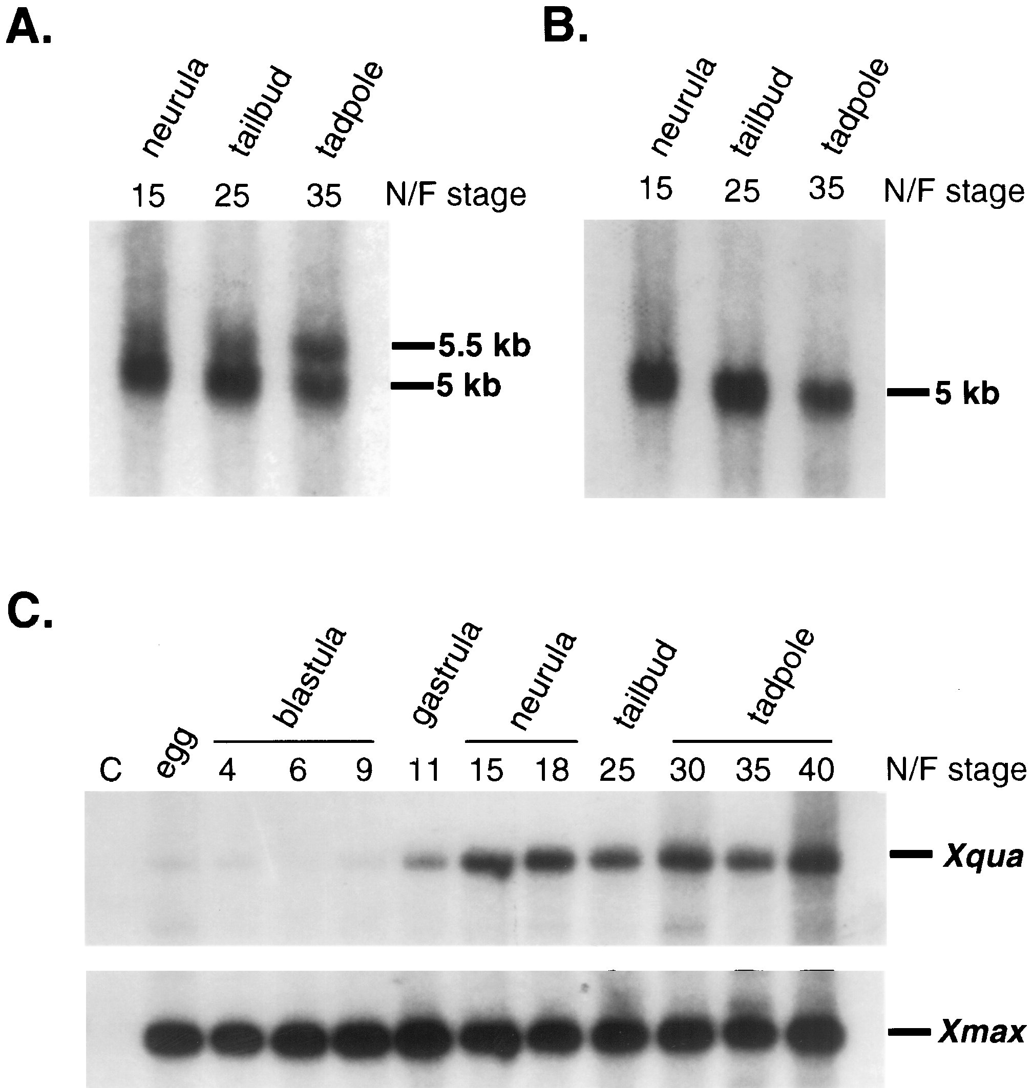Detection of quaking sequences in Xenopus embryonic mRNA. (A) Northern blot analysis of 10 μg poly(A)+RNA from Xenopus neurula, (stage 15), tailbud (stage 25) and tadpole (stage 35) embryos, probed with Xenopus quaking sequences detects two transcripts 5 kb and 5.5 kb in length. The probe cDNA fragment is derived from the coding region and spans the KH domain (nt 1â1718). (B) The same RNA blot probed with Xqua cDNA fragments derived from the 3â² UTR (nt 1718â2240 or nt 2450â3020), detects only the 5 kb mRNA. (C) Expression profile of the 5 kb Xqua transcript. Total RNA from five embryos at each stage was analyzed by RNase protection, using probe specific for the 5 kb Xqua transcript (nt 2046â2240), or probe for the control sequence XMax, which is expressed at constant levels throughout development ( Tonissen et al., 1994). Total RNA was isolated from Xenopus eggs and embryos as described by Melton and Cortese (1979)and purified further by precipitation with 4 M LiCl. Northern blot analysis was performed using random primed probes from three different Xqua cDNA fragments: (1) Xqua, NotI-EcoRI fragment, nt 1â1718; (2) Xqua, EcoRI fragment, nt 1718â2240; (3) Xqua, HindIII fragment, nt 2450â3020. Plasmid for generating Xqua 5 kb specific, antisense RNA probe was constructed by inserting a 520 bp EcoRI Xqua fragment (nt 1718â2240) into pBluescript SK (Stratagene). The template was linearized with PvuII and 32P-labeled probe was transcribed using T7 RNA polymerase. RNase protection assays were performed as described by Krieg and Melton (1987)with the Xqua probe and probe from the XMax-2 template, p4Z.MaxAH ( Tonissen and Krieg, 1994). |