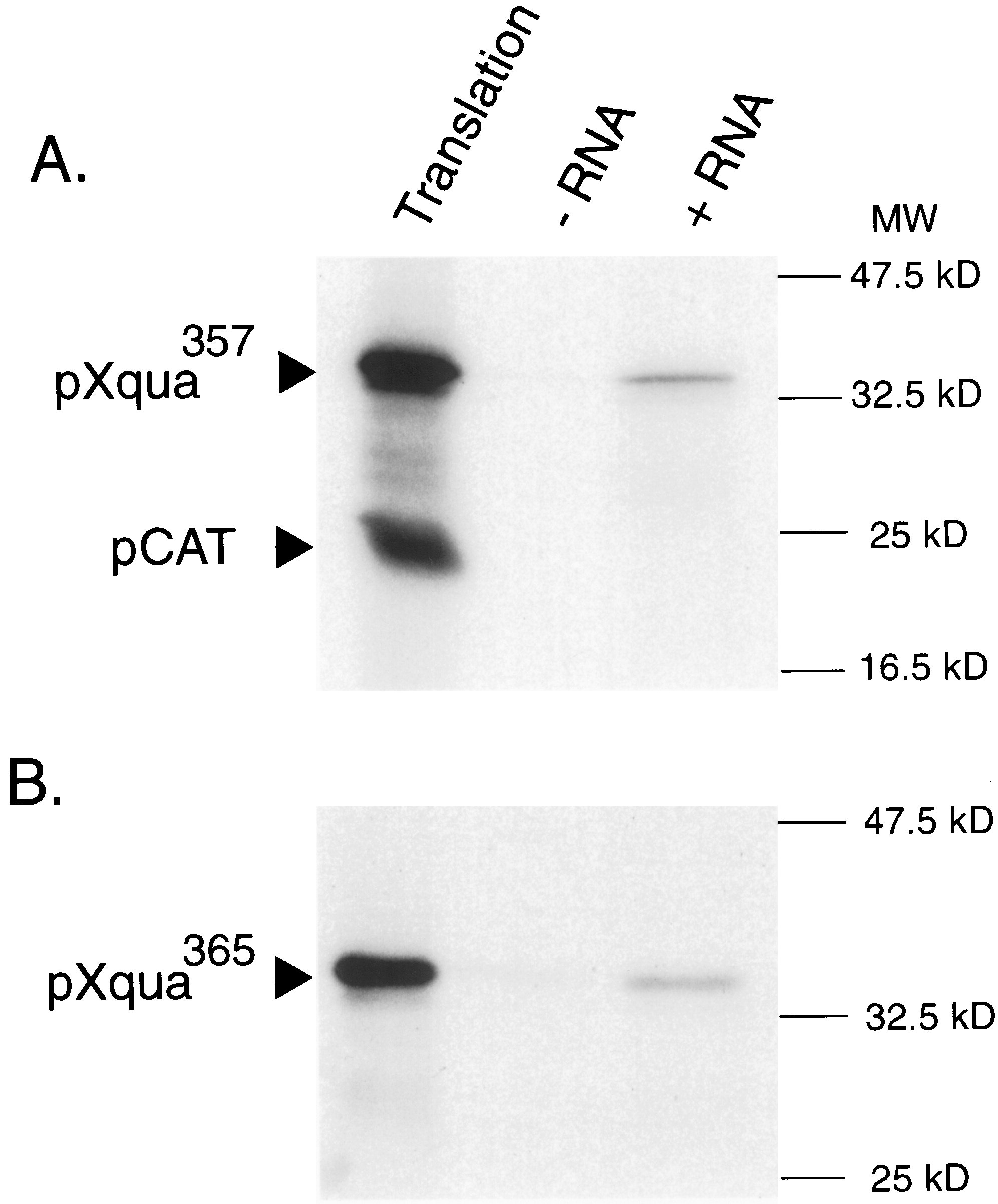 pXqua binds RNA in vitro. Binding of (A) pXqua357 and (B) pXqua365 to RNA in vitro. Synthetic mRNA encoding pXqua357 or pXqua365 was translated in vitro in reticulocyte lysates in the presence of [35S]methionine. An amount equal to 20% of the protein(s) used in each binding reaction is shown in the track marked translation. 35S-labeled proteins were bound to 30 μg of total Xenopus embryonic RNA-agarose (track labeled +RNA) in buffer containing 100 mM NaCl. As a control, an equal amount of protein was bound to agarose beads that were not coupled to RNA (track labeled −RNA). After extensive washing, protein retained on the RNA-agarose was analyzed by SDS-PAGE using a 12.5% gel and visualized by fluorography. The control CAT protein did not bind to the RNA-agarose. To generate labeled protein for RNA-binding studies, sequences encoding pXqua357 and pXqua365 were inserted into pT7TS vector (a modified version of pSP64T, Krieg and Melton, 1987). pT7TS-Xqua templates were linearized with BamHI and capped mRNA was produced using the Ambion Message Machine kit. Approx. 100 ng of synthetic mRNA encoding pXqua357, pXqua365 or pCAT (control sequence provided by BRL) was translated in vitro in the presence of [35S]methionine, using reticulocyte lysate (Ambion). To generate RNA-agarose, total Xenopus embryonic RNA at 1 mg/ml in water was biotinylated using photo-activated biotin-acetate (Vector Labs) according to the manufacturer's instructions. The RNA-biotin was then mixed with streptavidin-agarose resin (BRL) to a final concentration of 1–2 μg of RNA per 1 μl of agarose resin. RNA binding of in vitro translated proteins was assayed essentially as described by Swanson and Dreyfuss (1988)using approx. 105 dpm of labeled protein and 30 μl RNA-agarose resin. Proteins bound to the RNA-agarose were released by addition of SDS-protein loading buffer, boiled, and then resolved by SDS-PAGE and visualized by fluorography. In each experiment, control binding reactions were carried out with streptavidin-agarose (inactivated) that was not coupled to RNA. |