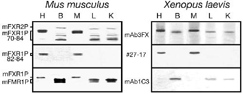 Expression of Fxr1p in mouse and frog. Immunoblot analyses of Fxr1p in selected tissues of adult mouse (left) and adult Xenopus (right). Antibody mAb3FX is directed against an epitope common to all Fxr1p isoforms from both mouse and frog, whereas #27-17 is directed against the 27-amino acid pocket coded by the exon 15 that also is present in Xenopus. Fmr1p is detected predominantly in brain extracts from both mouse and frog. Note the cross-reactivity between mAb1C3 and Fxr1p in mouse heart and muscle as described previously (Khandjian et al., 1998; Chemicon International information sheet, MAB2160). H, heart; B, brain; M, muscle; L, liver; and K, kidney.