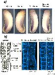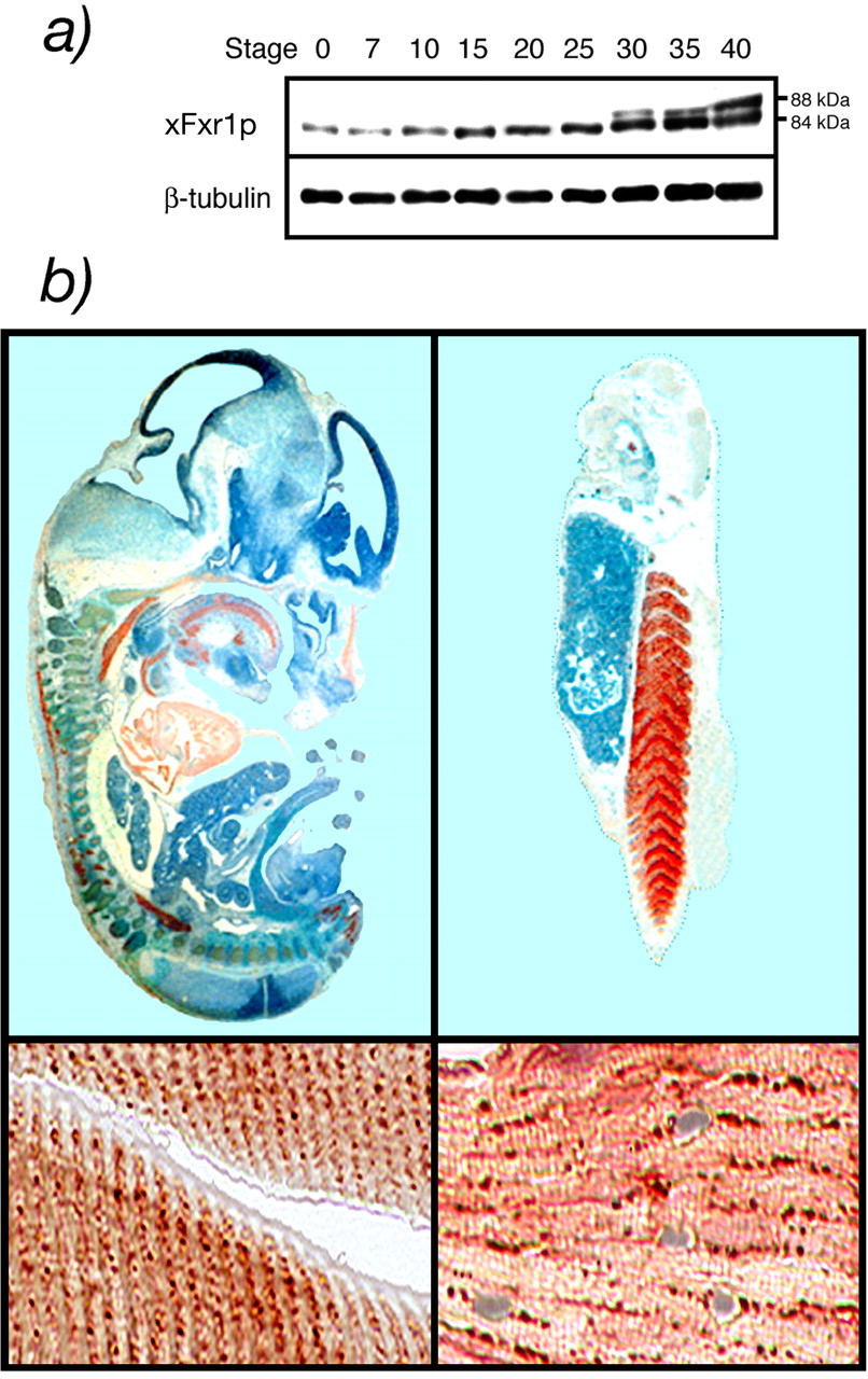 Figure 4. (a) Developmental profile of xFxr1p accumulation during the first stages of embryogenesis. β-tubulin was used as an internal marker. (b) Immunostained sections of a 12.5 dpc mouse embryo and stage 36 Xenopus embryos reacted with antibody #27-17-specific to the muscle-specific isoforms. Positive signals for Fxr1p were revealed with chromophore AEC (red staining). Counterstaining with hematoxylin (blue).