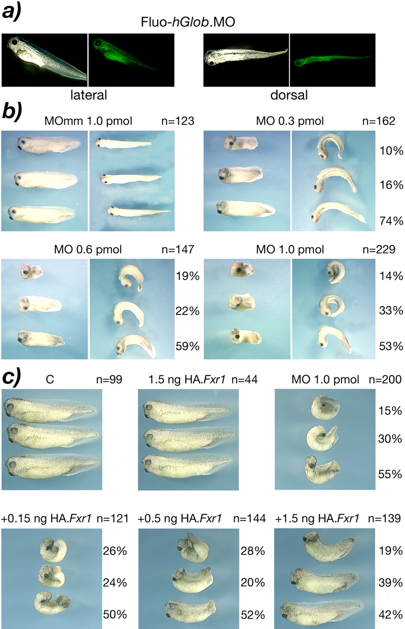 Figure 5. Morphological alterations induced in Xenopus embryos after injection of Fxr1.Morpholino (Fxr1.MO). (a) Lateral and dorsal views of control embryos for the diffusion of the fluorescein tagged Morpholino directed against the human globin (hGlob.MO) injected in one blastomere of two-cell stage embryos. (b) Injected embryos with xFxr1.MO mismatch (mm) as control, and with increasing concentrations of match MO. Number of injected embryos (n =) is on the right of each panel, as well as percentage of penetrance of the depicted phenotypes. The severity of morphological alterations is proportional to the concentration of injected Fxr1.MO (0.3-1.0 pmol). (c) Rescue of the phenotypes is dose-dependent of the injected HA.Fxr1 mRNA.