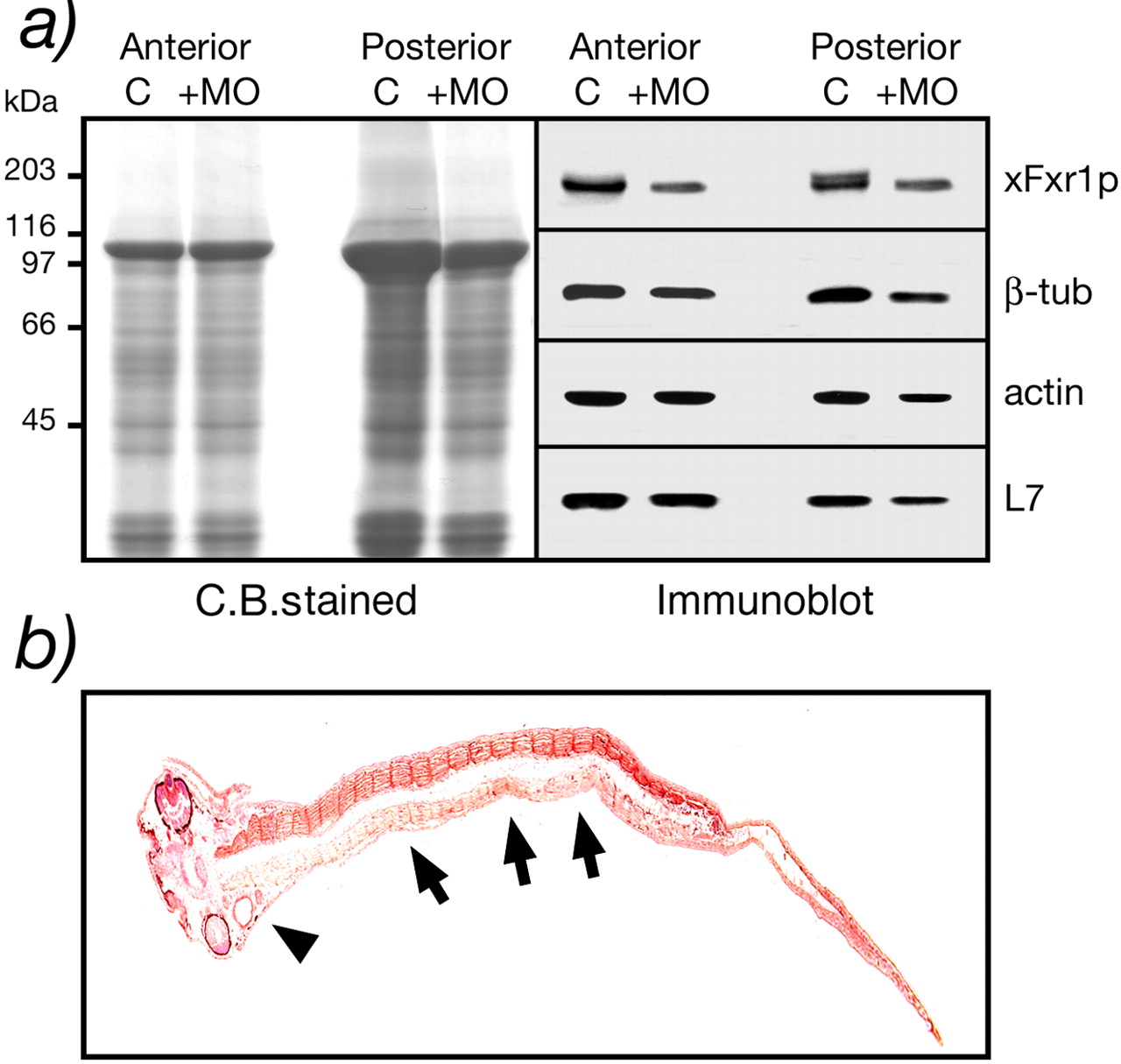 Figure 6. Biochemical evidence that xFxr1p levels decrease after xFxr1.MO treatment. (a) Coomassie-stained proteins after SDS-PAGE analysis of anterior and posterior extracts obtained from one embryo at stage 36 injected with 0.3 pmol of either xFxr1.MOmm (C, control) or xFxr1.MO (+MO). Western blot analysis using antibody mAb3FX for detection of xFxr1p, and antibodies to tubulin, actin, and ribosomal L7 proteins. (b) Partial inactivation of xFxr1correlates with decreased xFxr1p levels in the forming tail. Immunostaining view of a longitudinal section reacted with mAb3FX to detect Fxr1p. Note the reduced levels of xFxr1p in myotomes (arrows) as well as in the head (arrow head) in the injected side of the embryo.