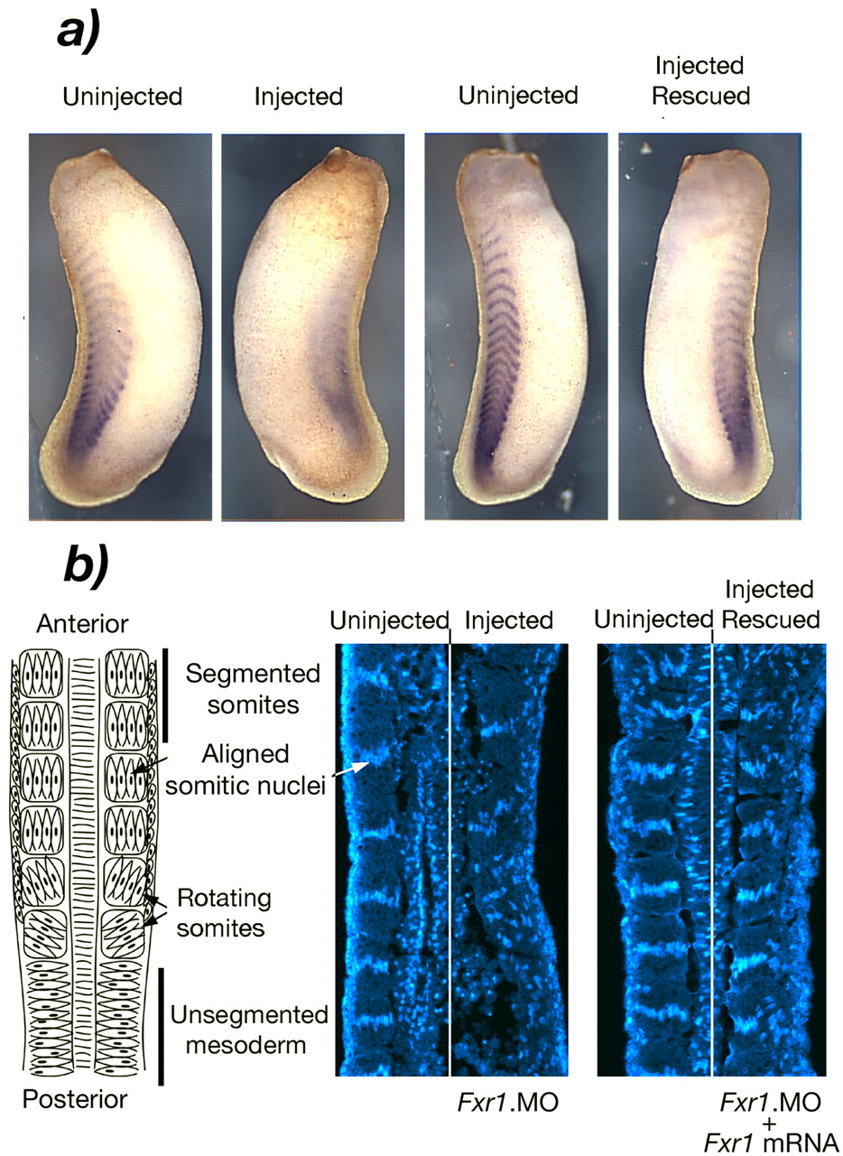 Figure 7. Depletion of Fxr1p alters somite formation. (a) In situ hybridization showing the presence of the lateralxMyoD mRNA in the control side, whereas a reduction is observed in the injected side. xMyoD mRNA levels are restored after coinjection with HA.xFr1 mRNA. (b) Left, schematic overview of somite formation in Xenopus. Middle, disruption of nuclear alignment in the injected side of the same embryo depicted in a, as detected by Hoechst staining (right side). Right, somitic nuclei are realigned after rescue with xFxr1 mRNA (same embryo as in a).