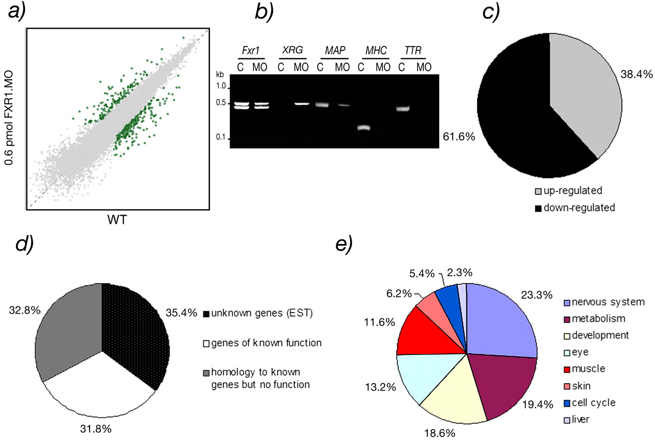 Microarray analyses of injected embryos with 0.6 pmol of xFxr1.MO versus wild-type embryos. (a) The data set in the squatter plot shows the expression levels of genes on a logarithmic scale as the median value of uninjected (x-axis) and xFxr1.MO injected (y-axis) embryos. The threshold for significancy (p < 0.05) was set at 2.5-fold of change. (b) Examples of validation of RT-PCR analyses of stable (Fxr1), increased (XIRG), and decreased (MAP2, TTR, and MHC) mRNAs in knockdown experiments. (c) Percentage of up- and down-regulated transcripts. (d) Percentage of transcripts of unknown (EST) or known functions, and those presenting homologies to genes not yet described in Xenopus. (e) Tissue distribution of the 129 known transcripts (31.8% in Figure 8d) affected. Note that due to overlapping of these transcripts in different tissues the distribution is only relative and cannot be considered as absolute.