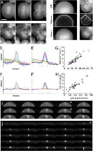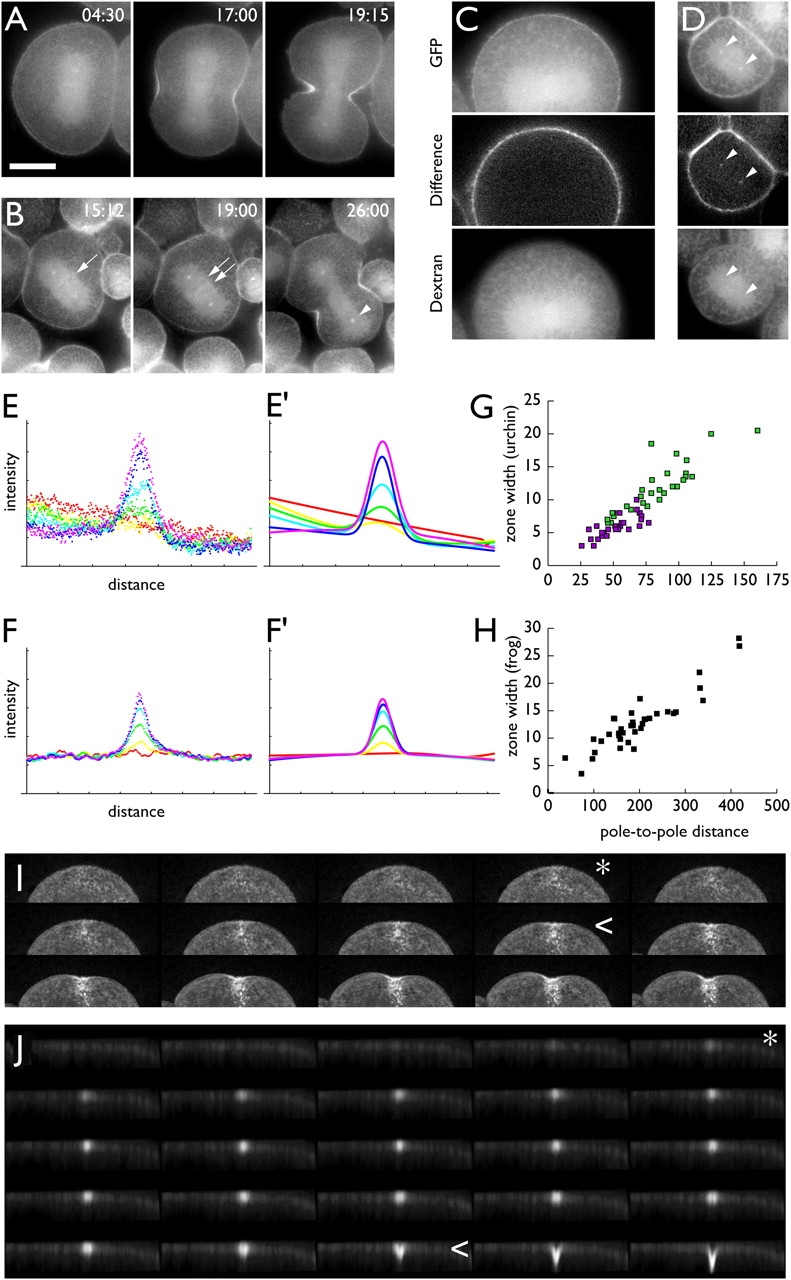 Figure 2. Characteristics of RhoA activity zones. (A) Single optical sections through a green urchin blastomere before, early, and late in furrowing showing zone in cross section. Bar, 25 μm. (B) Single optical sections through a blastomere from green urchin embryo showing eGFP-rGBD accumulation in spindle region. Chromosomes appear as a dark band (arrow, 15:12) that splits (arrows, 19:00) during anaphase. eGFP-rGBD highlights the centrosomes at all phases of mitosis (arrowhead, 26:00). Times are given in minutes:seconds after filming began. (C and D) Images of rGBD-eGFP (top), TRITC dextran (bottom), and difference images (middle) show that only the signal at the very cortex (C) and at the centrosome (D, arrowheads) is specific to eGFP-rGBD. Images in C are the mean of three successive frames and in D are the mean of 10 successive frames at 3-s intervals. (E and E′) eGFP-rGBD signal intensity measured along the cortex during division in green urchin. E shows raw data from single optical sections 2 min apart (from the cell shown in A), with time points ordered along the rainbow from red to violet. E′ shows curves obtained by fitting a weighted sum of a Gaussian and quadratic to the data in E. The Gaussian fits the furrow signal, whereas the quadratic fits the rest of the cortex. In this and five similar traces we performed, we note that the width of the fit Gaussian varies by 10% or less as the furrow ingresses despite the increasing curvature of the cortex. (F and F′) eGFP-rGBD signal intensity measured along the cortex during division in X. laevis embryo presented as in E and E' except that time points are 20 s apart. (G) Scatter plot of RhoA activity zone width versus cell diameter in urchin embryos; purple squares come from purple urchins; green squares come from green urchins. (H) Scatter plot of RhoA activity zone width versus cell size in X. laevis embryos. (I) Surface view of deconvolved series showing that eGFP-rGBD concentration (asterisk) precedes furrowing (<) in purple urchin embryos; frames are 20 s apart. (J) Z image series showing that eGFP-rGBD concentration (asterisk) precedes furrowing (<) in X. laevis embryos. |