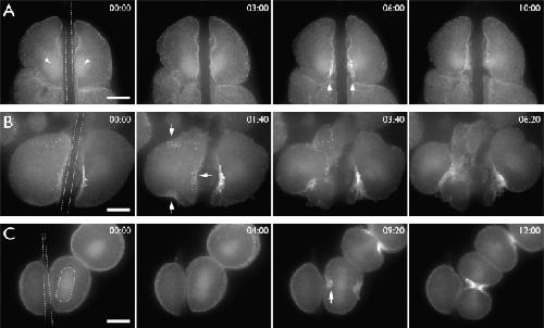Figure 7. Each half of the mitotic apparatus can induce one zone of RhoA activation and a corresponding furrow. Times are in minutes:seconds after the onset of filming (which began within a minute after cutting); dashed outline indicates the position of the needle. (A) Projection of eight sections through a cell bisected during metaphase. Arrowheads in the first frame indicate the centrosomes, which soon disappear from view. At approximately the time this cell would have entered anaphase, one patch of cortex near the spindle half in each cell fragment accumulates eGFP-rGBD (arrows, 06:00). (B) Projection of 10 sections through a cell cut in anaphase. The left spindle half moved away from the cut, whereas the right spindle half remained closer to the cut edge. In the left half, active RhoA immediately accumulated on the cut face near the site where the cut passed through the spindle. Within minutes, however, the spindle half in the left fragment induced a new zone (arrows in second frame), which proceeded to ingress, forming a tripartite furrow. The right half underwent unequal cleavage in association with an asymmetric RhoA zone and furrow. See Video 10 (available at http://www.jcb.org/cgi/content/full/jcb.200501131/DC1). (C) Projection of 12 sections through a cell cut (as a control for A and B) such that the entire spindle (dashed outline, 00:00) remains in one of the two fragments. Only the spindle-containing fragment exhibited elevated RhoA activity (arrow) and a cleavage furrow. Bars, 25 μm. |