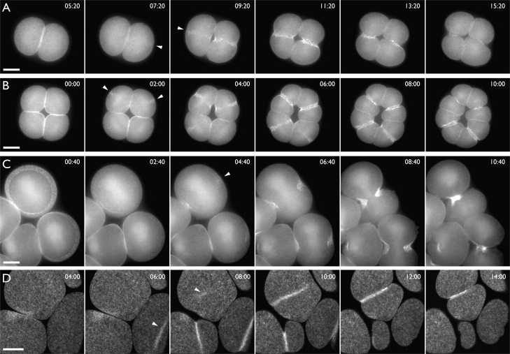 Figure 1. A zone of RhoA activity in echinoderm and amphibian cytokinesis. (A) Surface view of four-cell purple urchin embryo; projection of 18 1-μm sections. eGFP-rGBD begins to accumulate immediately before furrowing (arrowheads), brightens, and disappears once furrows are complete. (B) Surface view of eight-cell purple urchin embryo; projection of 18 1-μm sections. eGFP-rGBD accumulates before the furrow appears (arrowheads) at the site of the future furrow. (C) Sectional view through eight-cell green urchin embryo; projection of 16 1-μm sections. Before cleavage (00:00), eGFP-rGBD reveals uniform, cortical RhoA activity, which disappears (02:40) before localized activation of RhoA in the equator (arrowhead, 04:40), where the furrow will develop (06:40). (D) Surface view of X. laevis embryo; projection of 12 sections. eGFP-rGBD appears in narrow stripes (arrowheads) that presage furrow formation. See online supplemental material for Videos corresponding to B–D (Videos 1–3, respectively, available at http://www.jcb.org/cgi/content/full/jcb.200501131/DC1). Times are given in minutes:seconds after filming began. Bars, 25 μm. |
