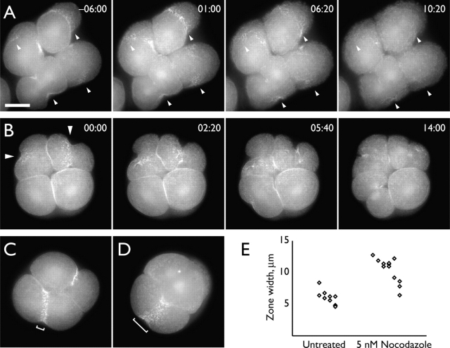 Figure 5. Microtubule disruption disrupts RhoA zone. (A) Projection of seven sections through a purple urchin embryo, which was first treated with 12 μM cytochalasin D immediately before furrowing, and then treated with 25 μM nocodazole at the time the furrows began to regress (00:00). Nocodazole causes rapid abolition of RhoA zones (arrowheads). Bar, 25 μm. (B) Projection of 18 sections through purple urchin embryo cultured in 5 nM nocodazole for 30 min before filming. Furrows in top two cells are associated with uneven, poorly bounded zones of RhoA activity (arrowheads, 00:00). Zones subsequently fragment, and furrows regress. (C) Projection of 18 sections through a control purple urchin embryo showing normal width and brightness of the RhoA zone during telophase. (D) Projection of 18 sections through a four-cell purple urchin embryo cultured in 5 nM nocodazole. The RhoA zone is much wider than controls (compare brackets in C and D). (E) Scatter plot showing that RhoA zones are consistently wider in embryos treated with 5 nM nocodazole. Zones were measured at the point just after ingression begins (exemplified by the lower left furrows in C and D) in four untreated and six treated embryos of equivalent developmental stage (four and eight cell) from identical experiments on two successive days. Measurements from the same embryo are aligned vertically. Control and nocodazole-treated cells are significantly different (t test: P = 10−6). |