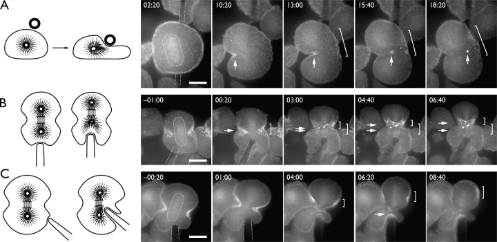 Figure 6. Physical displacement of the cortex relative to the spindle midplane modifies the RhoA zone. All times in this figure are in minutes:seconds relative to the physical perturbation indicated in the diagrams on the left. In each case, the dashed outlines in the first frame show the position of the spindle and the glass needle. Blastomeres from green urchin embryos at the 32–64-cell stage were used for these experiments. (A) Projection of four sections through a cell upon which the needle was pressed slightly to one side of the spindle, distending a portion of the cell into a pouch ∼10 μm thick. The side nearer the spindle initiates a tightly focused RhoA activity-rich furrow that ingresses (arrows); the far side accumulates active RhoA (brackets) but fails to focus it, and a series of shallow, unstable furrows develop and regress. (B) Projection of nine sections through a blastomere in which the spindle was displaced along the polar axis after furrow initiation. In the first frame, the blunt-ended needle is parked against one pole of the cell, slightly denting it. At 00:00, the needle was advanced by ∼15 μm (without penetrating the cell membrane), shoving the spindle so that the midplane shifts up relative to the furrow. Arrow and bracket in 00:20 mark the position immediately after the shove of the furrow and the RhoA zone, respectively, and remain the same for comparison in subsequent frames. The RhoA zone climbs higher on the cortex after the spindle midplane and is followed, in turn, by the furrow (second set of brackets and arrows in 03:00–06:40) such that the cell cleaves asymmetrically. (C) Projection of eight sections through a cell subjected to the converse of B: the cortex was displaced by a blunt needle toward the spindle midzone. In −00:20, the needle is parked slightly off center; at 00:00, the needle was advanced to bring a patch of nonequatorial cortex deep into the equatorial zone. At 06:20, needle tip shows accumulation of active RhoA (arrow). In addition, the original RhoA zone slides up the cortex (brackets in 04:00–08:40), apparently after half of the mitotic apparatus is broken by the needle. See online supplemental material for videos corresponding to A (Video 8) and B (Video 9, available at http://www.jcb.org/cgi/content/full/jcb.200501131/DC1). Bars, 25 μm. |