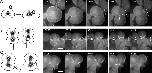 Figure 3. RhoA zones accompany divergent forms of cytokinesis. (A) Micromere formation in green urchin embryos. Projection of 12 1-μm sections of an eight-cell green urchin embryo. Dashed outlines in first frame show spindle position and orientation. Cell at top forms a circumferential furrow above the spindle midplane; in other cells, the asymmetric position of the spindle corresponds to asymmetric furrowing, and the region of concentrated eGFP-rGBD spreads around the circumference as furrowing proceeds. (B) Polar body formation in X. laevis oocytes. Projection of 13 optical sections showing that eGFP-rGBD becomes concentrated in a circular region at the animal pole and constricts inward. Arrowheads indicate edges of zone. (C) Dual-labelled images from projection of 13 optical planes showing tubulin (red) and eGFP-rGBD (green) during polar body emission. Top row shows facing view; circular region of concentrated eGFP-rGBD closes inward around microtubules of the first meiotic spindle. Bottom three rows show Z view in which eGFP-rGBD is seen to contract inward and downward in concert with the closure of the cytokinetic array, which pinches off the forming polar body. The microscope was refocused at 05:20 to allow the eGFP-rGBD ring to be followed deeper into the cytoplasm. See online supplemental material for videos corresponding to A (Video 4) and C (Video 5, available at http://www.jcb.org/cgi/content/full/jcb.200501131/DC1). All times are in minutes:seconds after filming began. Bars, 25 μm. |
