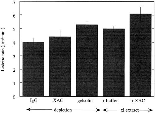 Figure 5. Bar graph representing analysis of Listeria movement rate during various extract treatments. The rates were measured using Image 1 software or Winview software. The number of tails measured for each treatment were: IgG depletion, 25; XAC depletion, 24; gelsolin depletion, 34; buffer addition, 27, and XAC addition (to 5.0 μM), 24, over four experiments using two separate extract preps. Error bars represent standard deviation of the mean.
