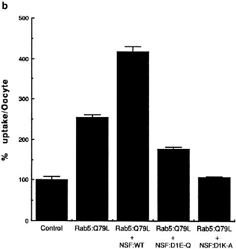 Figure 5. Effect of NSF on HRP uptake by oocytes. (a) Cells were injected with either 100 ng of Rab5:Q79L with or without anti-NSF (200 ng) antibody. Uptake was carried out as described in Materials and Methods. Results were expressed as percentage of control uptake (180 ng/oocyte) from the average of eight experiments. (b) Oocytes were injected with 75 ng of Rab5:Q79L alone or with 100 ng of NSF and its mutants as indicated. Uptake was determined as described, and the results are expressed as percentage of control (220 ng per oocyte) uptake.
