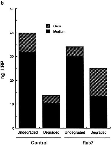 Figure 7. Rab7-mediated inactivation/degradation of HRP by oocytes. (a) Oocytes were preloaded with HRP by incubating with HRP (2 mg/ml) for 1 h at 18°C. Preloaded cells were washed and incubated with 100 μM monensin or control buffer as indicated for 1 h at 18°C. The cells were then injected with 100 ng of the respective fusion proteins. HRP activity present in the cells was measured after a 2-h incubation at 18°C. Results are expressed as percentage of control (110 ng HRP/oocyte) from the average of eight experiments. (b) Oocytes were incubated with 125I-HRP (0.5 mg/ml; 2 × 105 cpm/μg) for 1 h at 18°C and washed three times to remove unbound radioactivity. Subsequently, the cells were injected with 100 ng of Rab7:WT protein or control buffer, and nine oocytes were incubated in 300 μl of MBS for 2 h at 18°C. Oocytes were washed and solublized in PBS containing 0.1% Triton X-100, and TCA-soluble and -precipitable radioactivity was determined in cell lysates and media. Results are expressed as ng of HRP associated with or degraded by the cells.