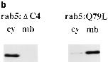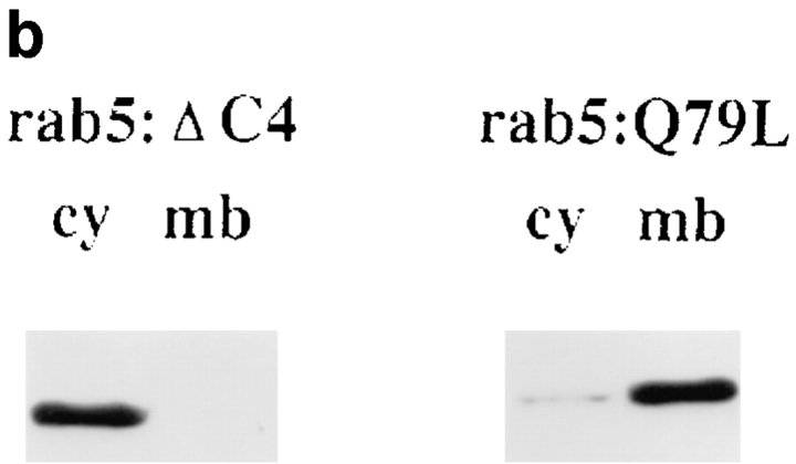Figure 3. Effect of Rab5 and its mutants on endocytosis in oocytes. (a) Oocytes were injected with 100 ng each of the indicated proteins, and the uptake was carried out as described in Fig. 1. The results were expressed as percentage of control (200 ng/oocyte) ± SD. (b) Oocytes were injected with 100 ng of Rab5:Q79L or Rab5:ΔC4 in 50 nl of microinjection buffer and incubated for 2 h at 18°C. The cells were lysed, and crude membrane and cytosolic fractions were prepared by centrifuging at 70,000 rpm for 15 min. Each fraction (5 μg) was separated by SDS-PAGE and transferred onto nitrocellulose, and Rab5 protein was localized using polyclonal Rab5-specific antibodies (Alvarez-Dominguez et al., 1996).