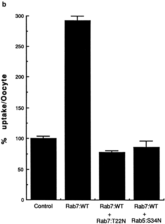 Figure 8. Rab5 regulation of endocytosis is upstream of Rab7. (a) Rab5 proteins were injected alone (50 ng) or in combination with both mutants (100 ng) of Rab5 and Rab7. (b) Rab7 proteins (50 ng) were injected alone or in combination with both mutants (100 ng) of Rab5 and Rab7. Results are expressed as percentage of control uptake by uninjected oocytes (average of eight experiments).