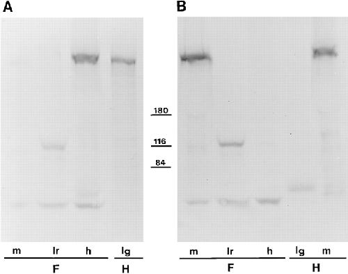 Figure 2 Western blot analysis of human and Xenopus utrophin (A) and dystrophin (B). The Xenopus (frog, F) tissues analyzed were skeletal muscle (m), liver (lr), and heart (h), and the human (H) tissues were skeletal muscle and lung (lg). Positions of molecular mass markers at 180, 116, and 84 kD are shown, while utrophin and dystrophin migrate at â¼400 kD. Lower molecular mass bands at â¼50 and 120 kD are nonspecific and due to cross reactions of the second antibody system. |