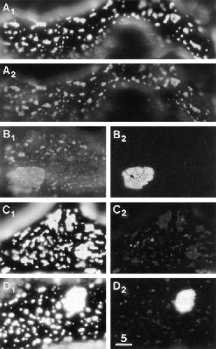 Figure 10 Laminin-induced clusters contain dystrophin but lack AChRs, utrophin, and PY. (A1 and A2) LBS and dystrophin immunofluorescence, revealing excellent colocalization. (B1 and B2) Dystrophin immunofluorescence and AChR stain, revealing AChRs at a megacluster but not at laminin-induced macroclusters. (C1 and C2) LBS and utrophin immunofluorescence. Utrophin was not detected at laminin-induced clusters (but was always observed wherever AChRs were clustered). (D1 and D2) LBS and PY immunofluorescence, revealing PY at a megacluster but not at the laminin-induced macroclusters. The laminin treatment was 2.4 nM for 3 d in A and C, 6 nM for 2 d in B, and 6 nM for 1 d in D. Some slight bleedthrough of the bright LBS immunofluorescence is seen in C2 and D2. Bar, 5 μm. |