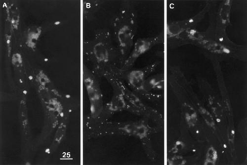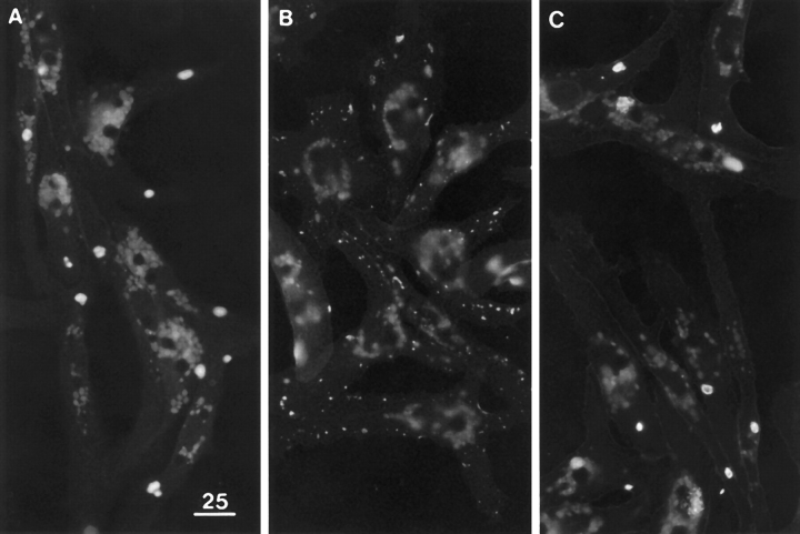 Figure 11 Effect of agrin and laminin on megaclusters. Cultures were stained for AChRs and photographed at low magnification. (A) In control cultures each muscle cell typically has one or two megaclusters. (B) After treatment with agrin for 1 d, the muscle cells have many agrin-induced macroclusters but often lack megaclusters. (C) After treatment with 6 nM laminin for 1 d, each muscle cell still has one or two megaclusters. Variable numbers of autofluorescent yolk granules are apparent in the central regions of the cells. The faint outlining of some of the cells in C is due to bleedthrough of the very bright LBS immunofluorescence (not shown) at cell peripheries. Bar, 25 μm. |