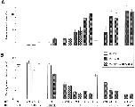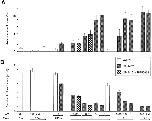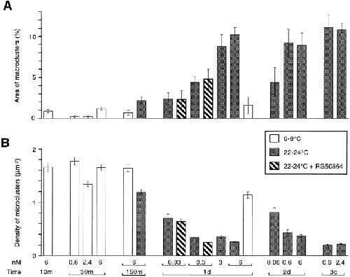 Figure 6 Effect of laminin treatment on (A) the percentage of surface area occupied by LBS macroclusters and (B) the density of LBS microclusters. Laminin concentrations (in nM) and exposure times are indicated at the bottom of B. The cultures were treated with laminin either at low temperature (open columns) or at room temperature (shaded columns). In some cases the laminin treatment was carried out in the presence of RG50864 (striped columns). On average the means and standard errors are based on 26 cells (range, 9–79). |