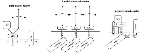 Figure 12. Schematic representation of some of the surface proteins clustered by laminin and agrin, both of which bind to αDG. Before clustering, DG complexes of αDG and βDG are considered to be mobile, like AChRs. Laminin-induced clusters of DG and dystrophin are considered to be linked by lamininâlaminin binding. They do not contain utrophin, AChRs, or tyrosine phosphorylated molecules. Not shown is that the end of the vertical short arm of laminin also participates in self binding; that laminin may bind to other sarcolemma-associated molecules; that dystrophin binds to cytoskeletal actin; and that sarcoglycans and syntrophins may also be present at laminin-induced clusters. Agrin-induced clusters contain DG, sarcoglycans (unlabeled), utrophin, β2 syntrophin (syn), tyrosine phosphorylated AChRs, rapsyn (rn), and tyrosine phosphorylated muscle specific kinase (MuSK). Their formation unlike the formation of laminin-induced clusters, involves stimulation of tyrosine kinase activity. |