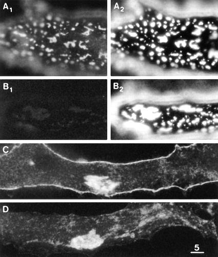 Figure 5 Laminin-induced clusters of βDG and LBS. (A1 and A2) βDG and LBS immunofluorescence after treatment with 2.4 nM laminin for 3 d, revealing large numbers of macroclusters and a greatly reduced density of microclusters (compare with Fig. 3 B). (B1 and B2) βDG immunofluorescence in the absence of permeabilization and LBS immunofluorescence after the same laminin treatment as in A. Only some slight âbleedthroughâ of the bright LBS immunofluorescence is seen in B1, thereby confirming that the immunofluorescence in A1 involved the binding of the antiβDG mAb to an intracellular epitope. (C) βDG immunofluorescence on the ventral surface of a cell after the same laminin treatment as in A. (D) βDG immunofluorescence on the ventral surface of a cell in a culture which was not treated with laminin. Comparison of C and D reveals that the laminin treatment induced an extensive accumulation of βDG at the cell periphery but did not induce clustering over the rest of the ventral surface which is inaccessible to laminin. The laminin-induced clustering at the cell periphery is out of focus in A and B2. Bar, 5 μm. |