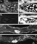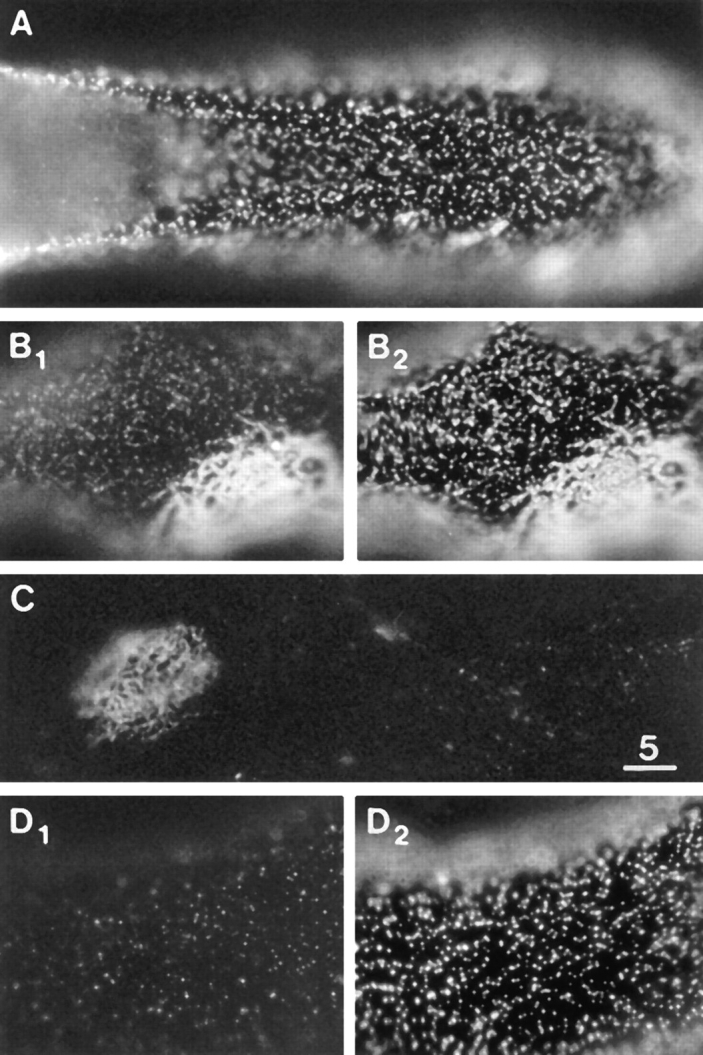 Figure 3 Distribution of DG and LBS on the dorsal surface of muscle cells in control cultures. (A) αDG immunofluorescence, revealing microclusters and a few macroclusters. (B1) βDG immunofluorescence. Part of a megacluster is seen. Microclusters are also apparent but are relatively faint. (B2) LBS immunofluorescence in same field as B1. Microclusters, as well as the megacluster, are well resolved. (C) Laminin immunofluorescence in the absence of pretreatment with laminin, revealing a megacluster but very few microclusters. (D1 and D2) αDG and LBS immunofluorescence, obtained by exposing the culture to 6 nM laminin for 10 min at low temperature, followed by staining for αDG and laminin. The brief pretreatment with laminin inhibited the staining for αDG (compare D1 with A). Bar, 5 μm. |