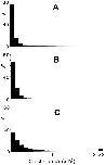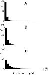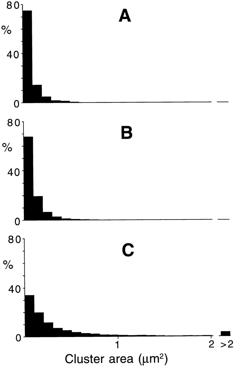 Figure 4 Sizes of individual αDG and LBS clusters. (A) αDG clusters (n = 4,989) in control cultures not exposed to laminin. (B) LBS clusters (n = 7,930) in control cultures exposed briefly (10–30 min) to laminin (0.6–6 nM) at low temperature immediately before staining. (C) LBS clusters (n = 3,621) after treatment with 6 mM laminin for 1 d at room temperature. In control cultures (A and B) there were very few macroclusters (>1 μm2), and most of the microclusters were <0.1 μm2. After treatment with laminin for 1 d (C) the incidence of macroclusters was increased whereas the incidence of the smallest microclusters was decreased. |