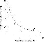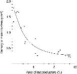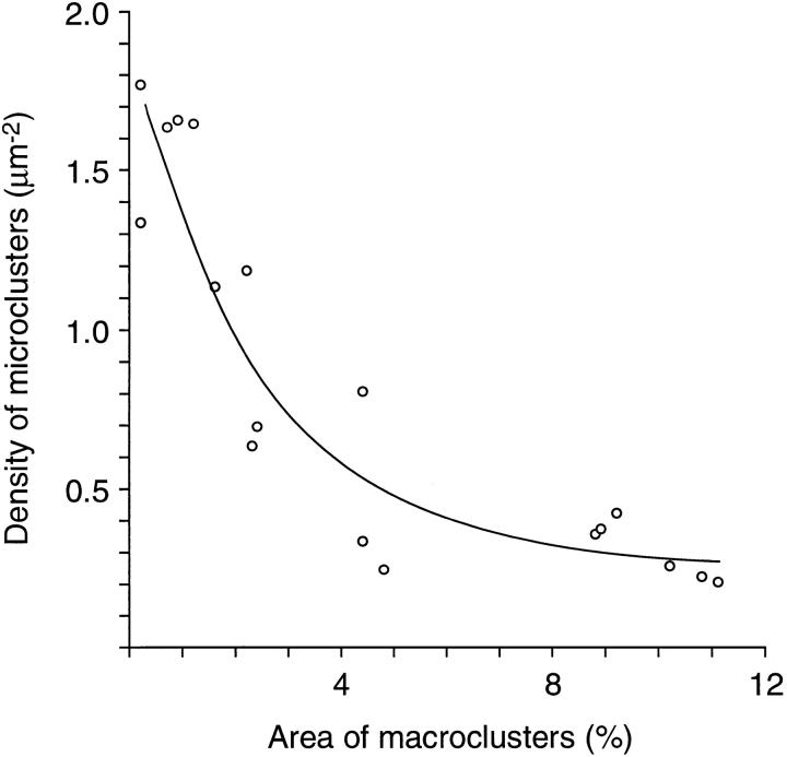 Figure 7. Relationship between the density of microclusters and the percentage of surface area occupied by macroclusters. From the data of Fig. 6. |