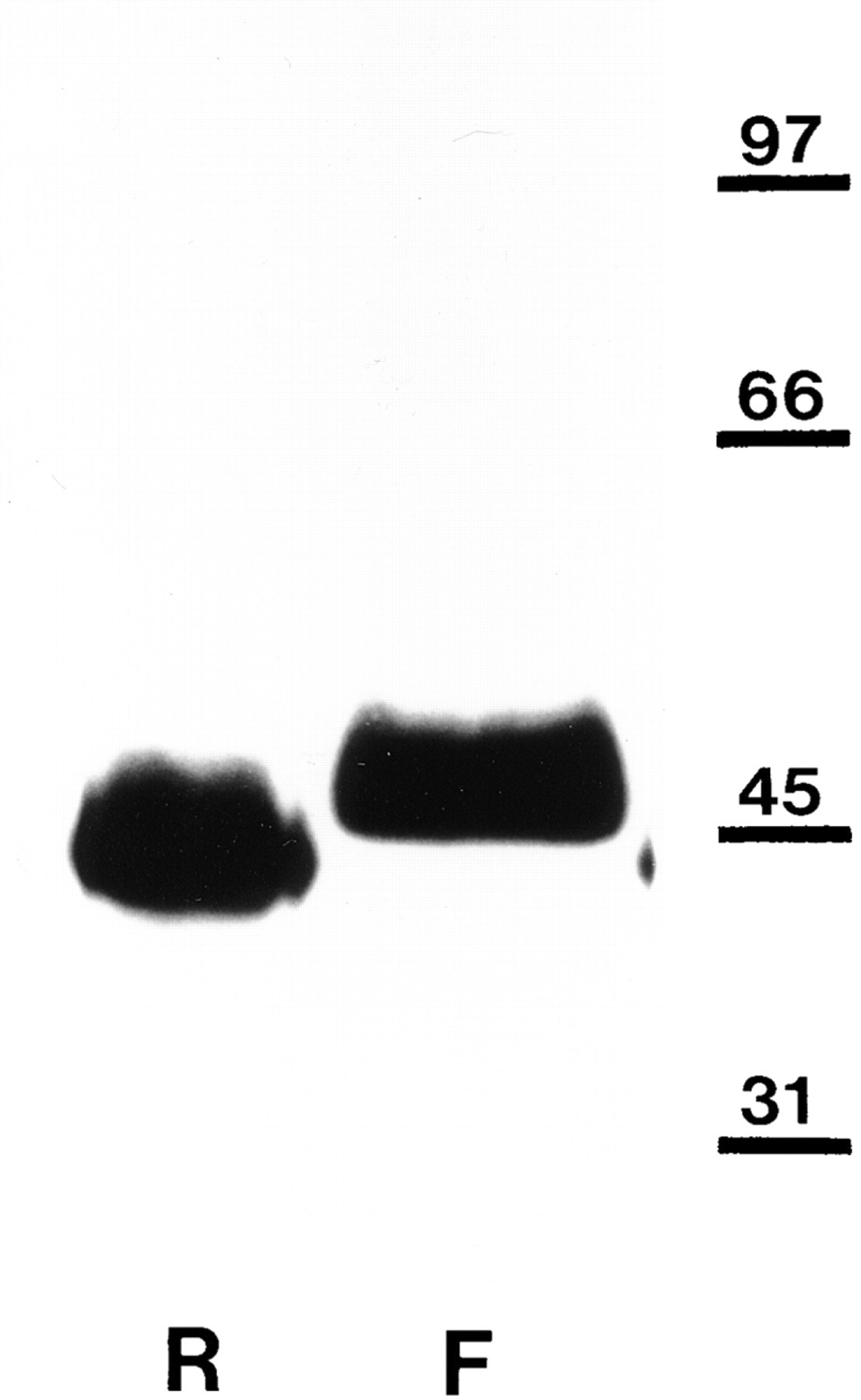 Figure 1. Western blot analysis of rabbit and Xenopus βDG. Nitrocellulose transfers of heavy microsomes from rabbit (R) and Xenopus (frog, F) muscle, which had been separated by SDSPAGE, were stained with mAb 43DAG1/8D5 raised to 15 of the last 16 amino acids at the extreme COOH terminus of the human dystroglycan sequence. It recognizes a band of roughly 43 kD in rabbit corresponding to the size of βDG (Ibraghimov-Beskrovnaya et al., 1992). A similar though somewhat larger band of 44–46 kD is visible in Xenopus. Molecular mass markers (in kD) are shown to the right. |