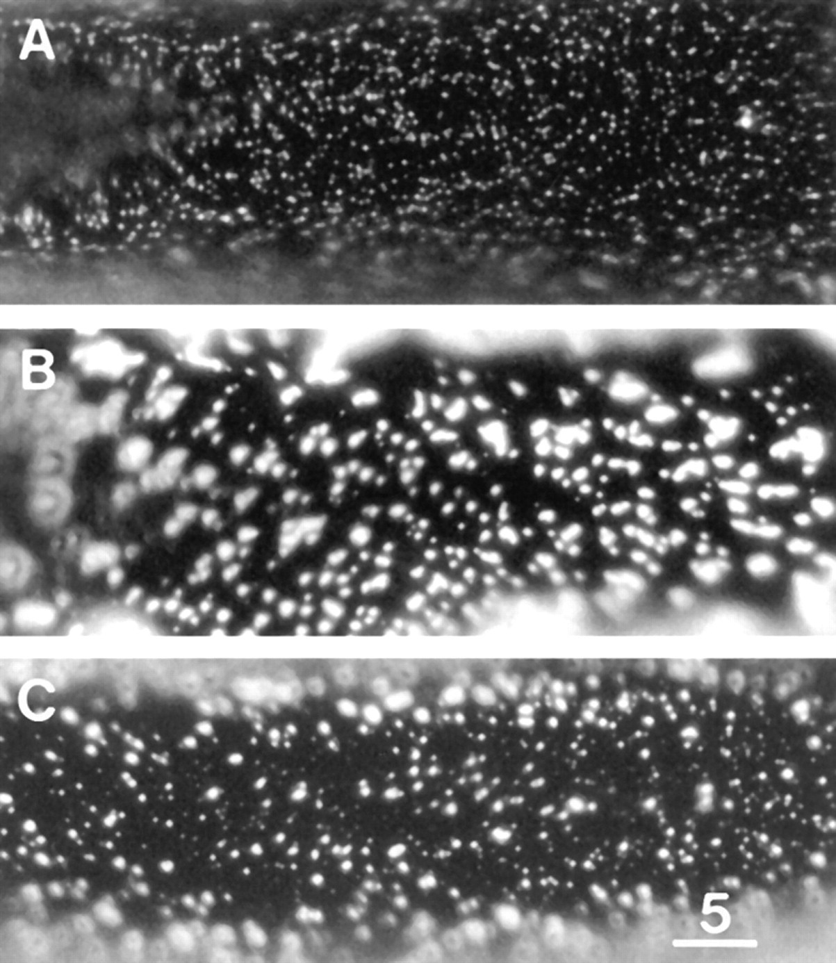 Figure 8. E3 lacks clustering activity and inhibits laminin-induced clustering. (A) E3 binding sites after treatment with 3.3 μM E3 for 2 d. Note the relatively high density of microclusters and the paucity of macroclusters. (B) LBS after treatment with 0.6 nM laminin for 1 d. (C) Laminin and E3 binding sites after treatment with 0.6 nM laminin and 3.3 μM E3 for 1 d. E3 inhibited the laminininduced clustering. Bar, 5 μm. |