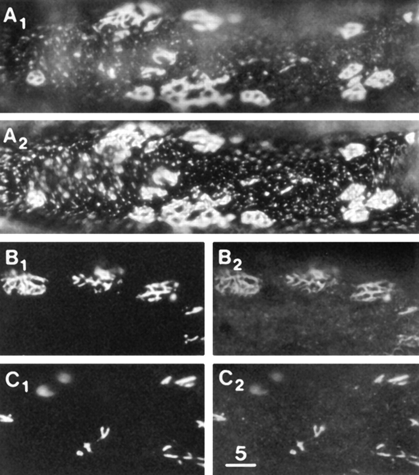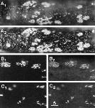 Figure 9 Agrin-induced clusters on the dorsal surface. (A1 and A2) βDG and LBS immunofluorescence, revealing several patterned clusters, excellent colocalization, and some decline in the density of microclusters in surrounding regions. (B1 and B2) AChR stain and utrophin immunofluorescence, revealing excellent colocalization. (C1 and C2) AChR stain and PY immunofluorescence, revealing excellent colocalization. The agrin treatment was 3 d in A and B and 2 d in C. Similar results were obtained when the agrin treatment was 1 d. Bar, 5 μm. |