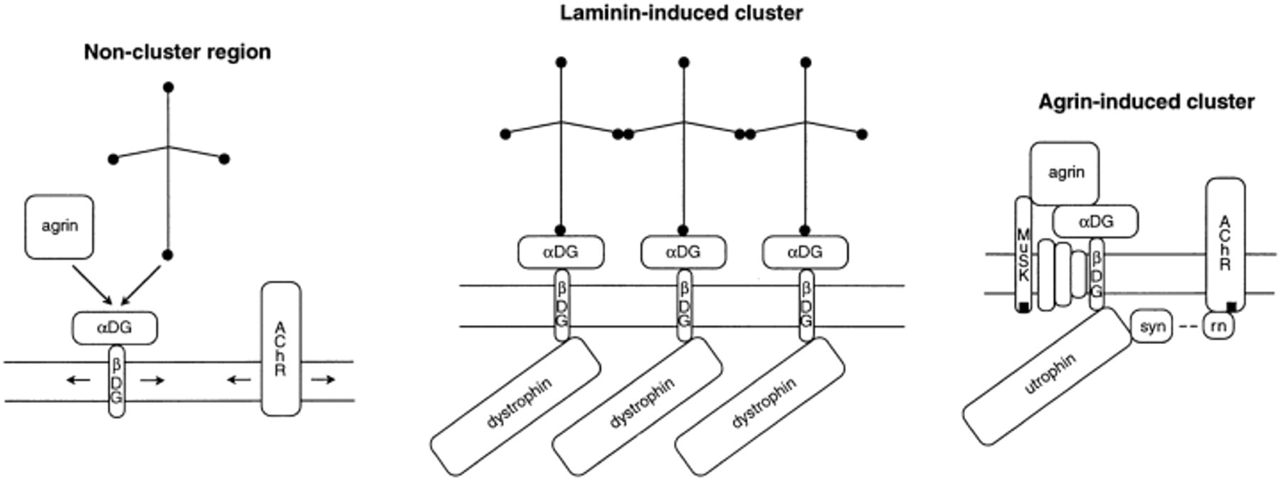 Figure 12 Schematic representation of some of the surface proteins clustered by laminin and agrin, both of which bind to αDG. Before clustering, DG complexes of αDG and βDG are considered to be mobile, like AChRs. Laminin-induced clusters of DG and dystrophin are considered to be linked by lamininâlaminin binding. They do not contain utrophin, AChRs, or tyrosine phosphorylated molecules. Not shown is that the end of the vertical short arm of laminin also participates in self binding; that laminin may bind to other sarcolemma-associated molecules; that dystrophin binds to cytoskeletal actin; and that sarcoglycans and syntrophins may also be present at laminin-induced clusters. Agrin-induced clusters contain DG, sarcoglycans (unlabeled), utrophin, β2 syntrophin (syn), tyrosine phosphorylated AChRs, rapsyn (rn), and tyrosine phosphorylated muscle specific kinase (MuSK). Their formation unlike the formation of laminin-induced clusters, involves stimulation of tyrosine kinase activity. |