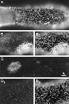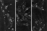 Figure 8 E3 lacks clustering activity and inhibits laminin-induced clustering. (A) E3 binding sites after treatment with 3.3 μM E3 for 2 d. Note the relatively high density of microclusters and the paucity of macroclusters. (B) LBS after treatment with 0.6 nM laminin for 1 d. (C) Laminin and E3 binding sites after treatment with 0.6 nM laminin and 3.3 μM E3 for 1 d. E3 inhibited the laminininduced clustering. Bar, 5 μm. |