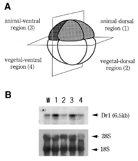of total RNAs were loaded (W, whole embryo; lane 1, animal-dorsal