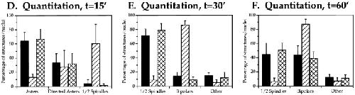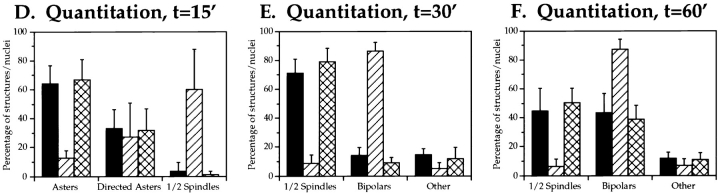 Figure 7. Addition of excess XCTK2 stimulates mitotic spindle assembly. Mitotic spindles were assembled in the presence of either (A) control buffer, (B) ∼10 μg/ml XCTK2, or (C) ∼10 μg/ml XCTK2 that had been heat killed for 5 min at 70°C before use. Spindles were assembled in CSF extracts that contained rhodamine-labeled tubulin and buffer or XCTK2 protein for 30 min and then sedimented onto coverslips. In the presence of excess XCTK2 protein, there is an increase in the percentage of bipolar spindles that formed. Six random structures were photographed from four to six fields of view, and they were compiled into the field of view that is shown. Rhodamine-labeled microtubules are shown. (D–F) Quantitation of excess XCTK2 addition. Spindles were assembled in CSF extracts in the presence of control buffer (black bar), ∼10 μg/ml XCTK2 (hatched bar), or ∼10 μg/ml heat-killed XCTK2 (cross-hatched bar) for 15–60 min and then sedimented onto coverslips. The percentage of asters, directed asters, and half spindles were quantitated at the 15 min time point, and the percentage of half spindles, bipolar spindles, and other structures that formed per nuclei were quantitated at the 30 and 60 min time points. The data are represented as mean ± 1 SD of four independent experiments (n ⩾ 800 nuclei for IgG addition; n ⩾ 800 nuclei for anti-CTP1 addition; n ⩾ 800 nuclei for anti-XCTK2 addition for each time point). Bar, 20 μm.