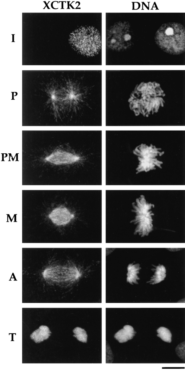 Figure 3. Immunolocalization of XCTK2 in Xenopus tissue culture cells. The cells were stained with 1 μg/ml anti-XCTK2 followed by FITC-conjugated goat anti–rabbit secondary antibody. DNA was visualized by staining with 0.05 μg/ml propidium iodide. Images were recorded on a laser scanning confocal microscope. Interphase (I); prophase (P); prometaphase (PM); metaphase (M); anaphase (A); telophase (T). Bar, 20 μm.