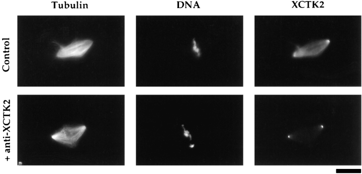 Figure 5. Anti-XCTK2 antibodies cause relocalization of XCTK2. Mitotic spindles were assembled in the presence of rhodamine-labeled tubulin in cycled CSF extracts for 60 min and then sedimented onto coverslips. (Top) Spindles were assembled, sedimented, fixed, and then stained with antiXCTK2 antibodies, followed by FITC-conjugated goat anti–rabbit secondary antibody. DNA was visualized by staining with Hoechst 33528. XCTK2 stains the spindle with an enrichment toward spindle poles. (Bottom) Spindles were assembled in the presence of anti-XCTK2 antibody, sedimented, fixed, and then stained with FITC-conjugated goat anti–rabbit secondary antibody. DNA was visualized by staining with Hoechst 33528. XCTK2 is now concentrated at spindle poles after assembly in the presence of anti-XCTK2 antibodies. Bar, 20 μm.
