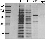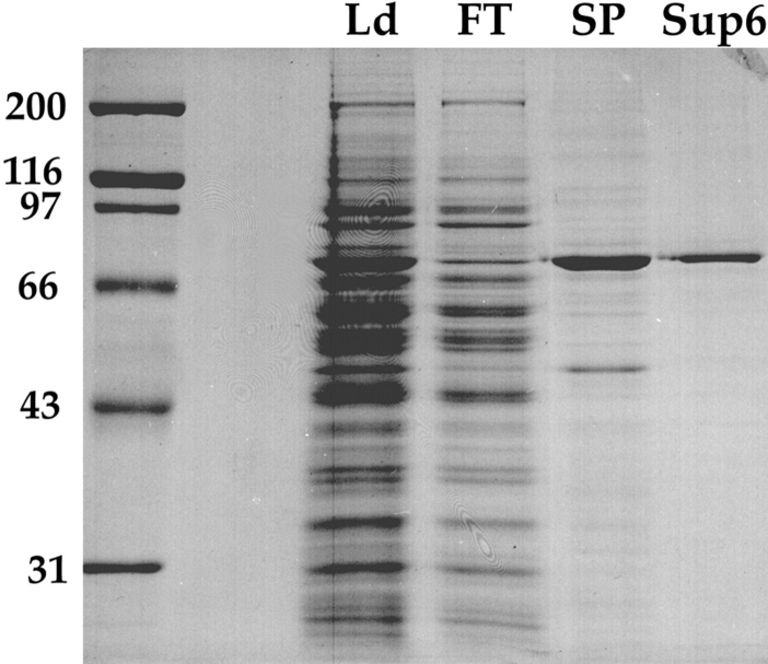 Figure 6. Purification of XCTK2. XCTK2 was expressed in insect Sf-9 cells using the baculovirus expression system. Lysates were made of infected Sf-9 cells, centrifuged and filtered through an HPLC syringe filter, run on a SP-Sepharose column (Hi-TrapTM; Pharmacia Fine Chemicals) and eluted with a linear 100–500 mM NaCl gradient. The peak fractions were pooled, concentrated, and run on a Superose 6 gel filtration column. The peak fractions were pooled, sucrose was added to 10% final wt/vol, and they were frozen in 15 μl aliquots at −80°C until use in the experiments described. Fractions from the purification were run on 10% SDS-PAGE and visualized by staining with Coomassie. (Ld) SPSepharose column load. (FT) SP-Sepharose column flow-through. (SP) Pool of peak XCTK2 containing fractions from SP-Sepharose column. (Sup6) Pool of peak XCTK2 containing fractions from Superose 6 column. Molecular mass markers are shown on the left side of the gel.