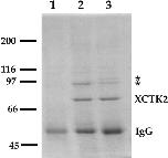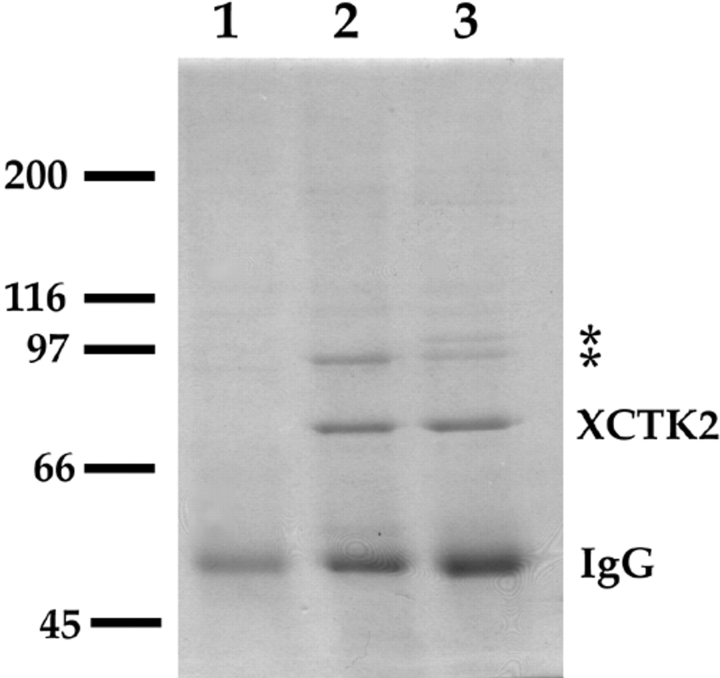 Figure 8. Immunoprecipitation of XCTK2 from egg extracts. Immunoprecipitation was performed using control rabbit IgG (lane 1), affinitypurified anti-CTP1 (lane 2), or affinity-purified anti-XCTK2 (lane 3). Antibody was bound to protein A beads and then incubated in Xenopus egg high speed supernatants that contained ∼10 μg/ ml XCTK2. The protein A complexes were washed, separated by 7.5% SDS-PAGE, and visualized by staining with Coomassie.