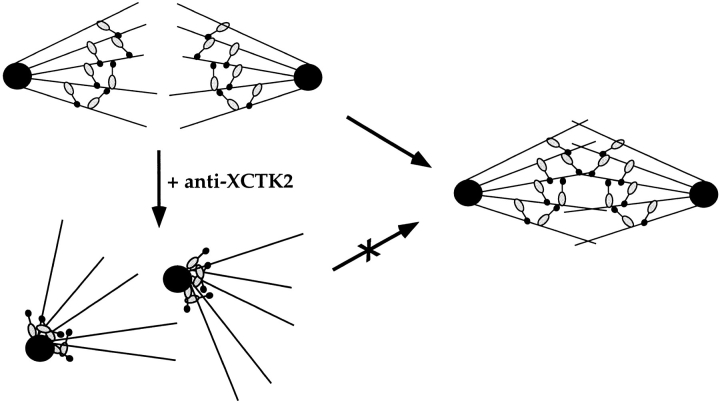 Figure 9. Model for XCTK2 function in spindle assembly. XCTK2 (lollipops) is required to bundle microtubules in each half spindle. A certain amount of bundling of microtubules is necessary for efficient fusion of half spindles to occur (top diagram). In the presence of anti-XCTK2 antibodies (lower diagram), the protein becomes mislocalized toward the spindle poles, and the spindles splay and are incapable of forming bipolar spindles.
