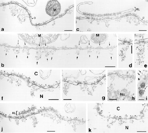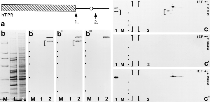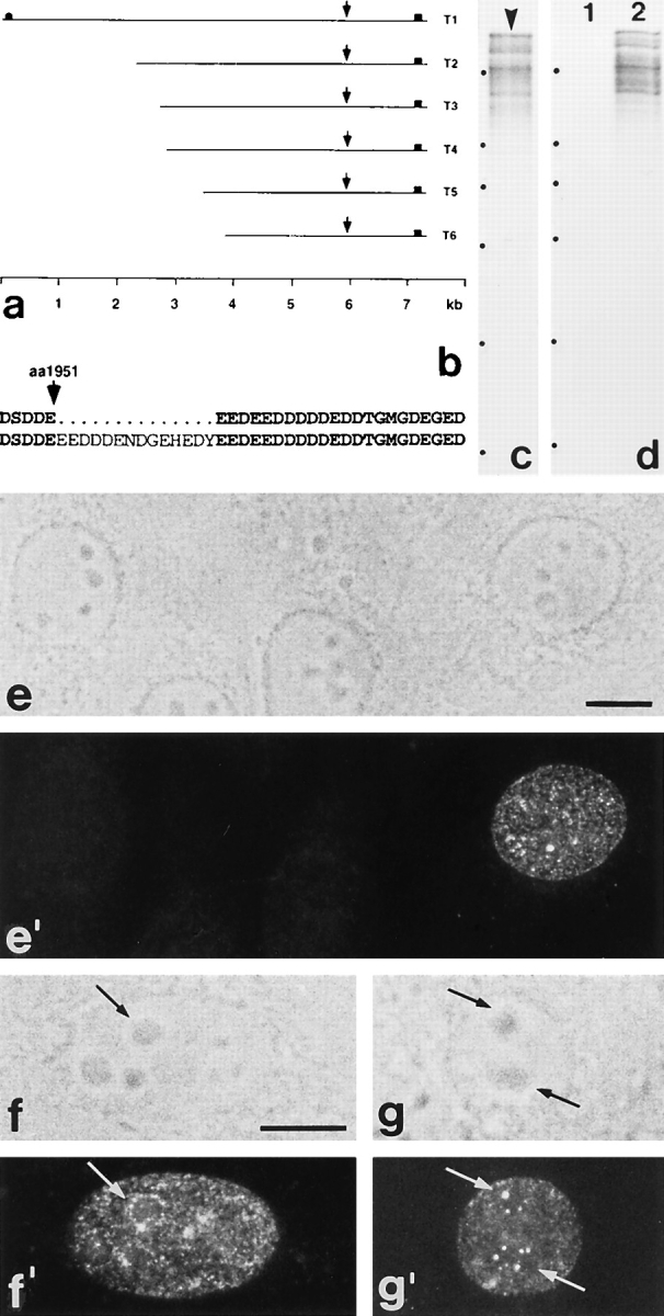 Using a monoclonal antibody, mAb 203-37, we have identified a polypeptide of M(r) approximately 270 kD (p270) as a general constituent of the intranuclear filaments attached to the nucleoplasmic annulus of the nuclear pore complex (NPC) in diverse kinds of vertebrate cells. Using cDNA cloning and immunobiochemistry, we show that human protein p270 has a predicted molecular mass of 267 kD and is essentially identical to the coiled-coil dominated protein Tpr reported by others to be located on the outer, i.e., cytoplasmic surface of NPCs (Byrd, D.A., D.J. Sweet, N. Pante, K.N. Konstantinov, T. Guan, A.C.S. Saphire, P.J. Mitchell, C.S. Cooper, U. Aebi, and L. Gerace. 1994. J. Cell Biol. 127: 1515-1526). To clarify this controversial localization, we have performed immunoelectron microscopy in diverse kinds of mammalian and amphibian cells with a series of antibodies raised against different epitopes of human and Xenopus laevis p270/Tpr. In these experiments, the protein has been consistently and exclusively detected in the NPC-attached intranuclear filaments, and p270/Tpr-containing filament bundles have been traced into the nuclear interior for up to 350 nm. No reaction has been noted at the cytoplasmic side of NPCs with any of the p270/Tpr antibodies, whereas control antibodies such as those against protein RanBP2/Nup358 specifically decorate the cytoplasmic annulus of NPCs. Pore complexes of cytoplasmic annulate lamellae in various mammalian and amphibian cells are also devoid of immunodetectable protein p270/Tpr. We conclude that this coiled-coil protein is a general and ubiquitous component of the intranuclear NPC-attached filaments and discuss its possible functions.