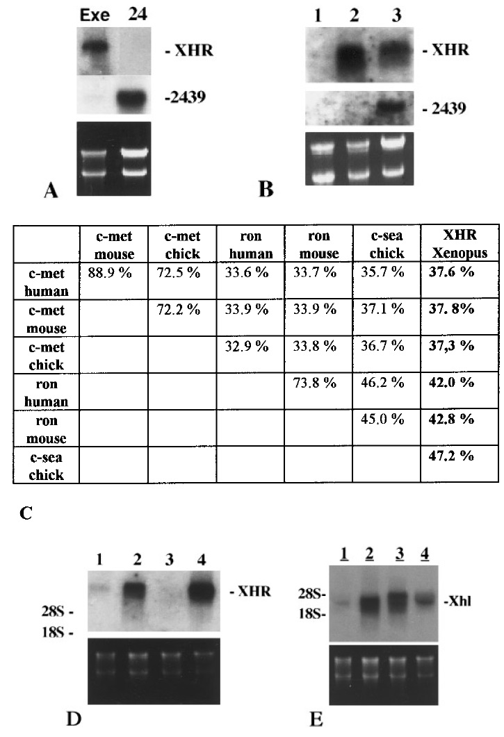 FIG. 2. A: Northern blot analysis showing that XHR mRNA is expressed in the ectoderm of completely exogastrulated embryos (Exe) cultured until sibling embryos reached stage 24 of development. 24: stage 24 sibling embryos. The same blot was reprobed with a neural-specific RNA-binding protein (24-39) (22). B: Northern blot analysis comparing XHRmRNA transcription in disaggregated/reaggregated and untreated animal caps. 1: Ectodermal explants isolated at stage 9 and frozen immediately afterwards. 2: Ectodermal explants isolated at stage 9 but cultured for 30 h. 3: Disaggregated and reaggregated ectodermal explants cultured for 30 h after reaggregation. The same filter was reprobed with a neural-specific RNA binding protein (24-39) (22). C: Results of alignment analysis of all known members of the Met/HGF-receptor family. Numbers indicate the percentage of identity between the deduced amino acid sequences of human c-met, mouse c-met, chick c-met, human and mouse Ron, chick c-sea and Xenopus XHR. D-E: Northern blot analysis showing the tissue-specific expression pattern of XHR (D) and XHL (E)mRNA in adult frogs. 1: Brain; 2: Kidney; 3: Liver; 4: Lung; Ethidium bromide-stained gels were photographed for documentation of RNA loading.