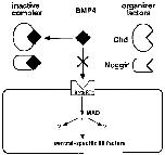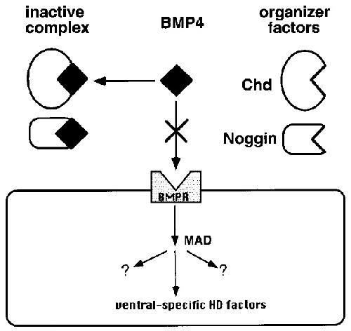FIG. 3. The organizer factors inactivate BMP-4 by binding it in the extracellular space. Both chordin and noggin bind to BMP-4 and inhibit BMP-4 protein from binding to its own receptor. Down-stream of the BMP receptor, the vertebrate homologue of Drosoph-ila mother against dpp (MAD) seems to play a fundamental role in the signal transmission to the nucleus. Among the target genes in the BMPR signaling pathways are ventral-specific homeodomain (HD) proteins. Both MAD and ventral HD factors can mimic the ventralizing activity of BMP-4 by microinjection. |