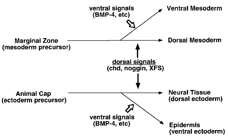 FIG. 1. Dorsal and ventral signals change the fate of tissues by providing varying dorsal– ventral positional information (Sasai et al., 1995). (A) The dorsal signals from the frog organizer, chordin, noggin, and follistatin (XFS) act on both marginal zone cells (meso-dermal precursors) and animal cap cells (ectodermal precursors) and induce dorsal-type tissues: dorsal mesoderm (notochord and muscle) and neural tissues, respectively. Ventral signals such as BMP-4 also change the fate of both mesodermand ectoderm, gener-ating ventral mesoderm (blood, mesothelium, and mesenchyme) and epidermis. Thus, the same set of antagonizing regulatory signals, the organizer factors vs BMP-4, can pattern both germ layers. |